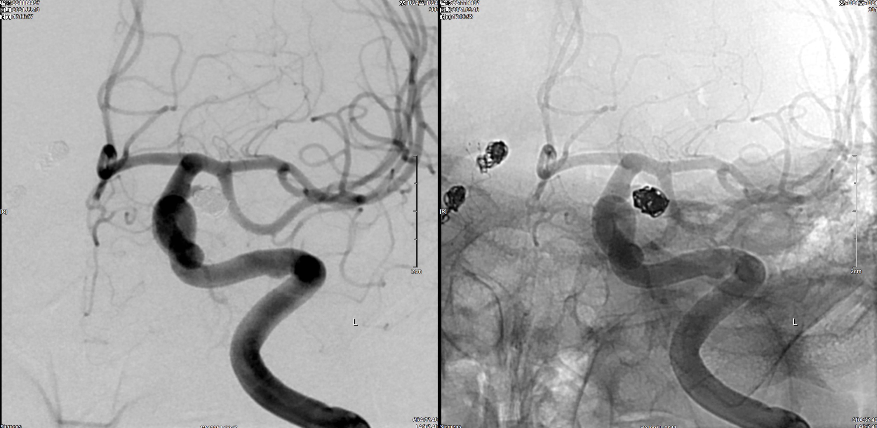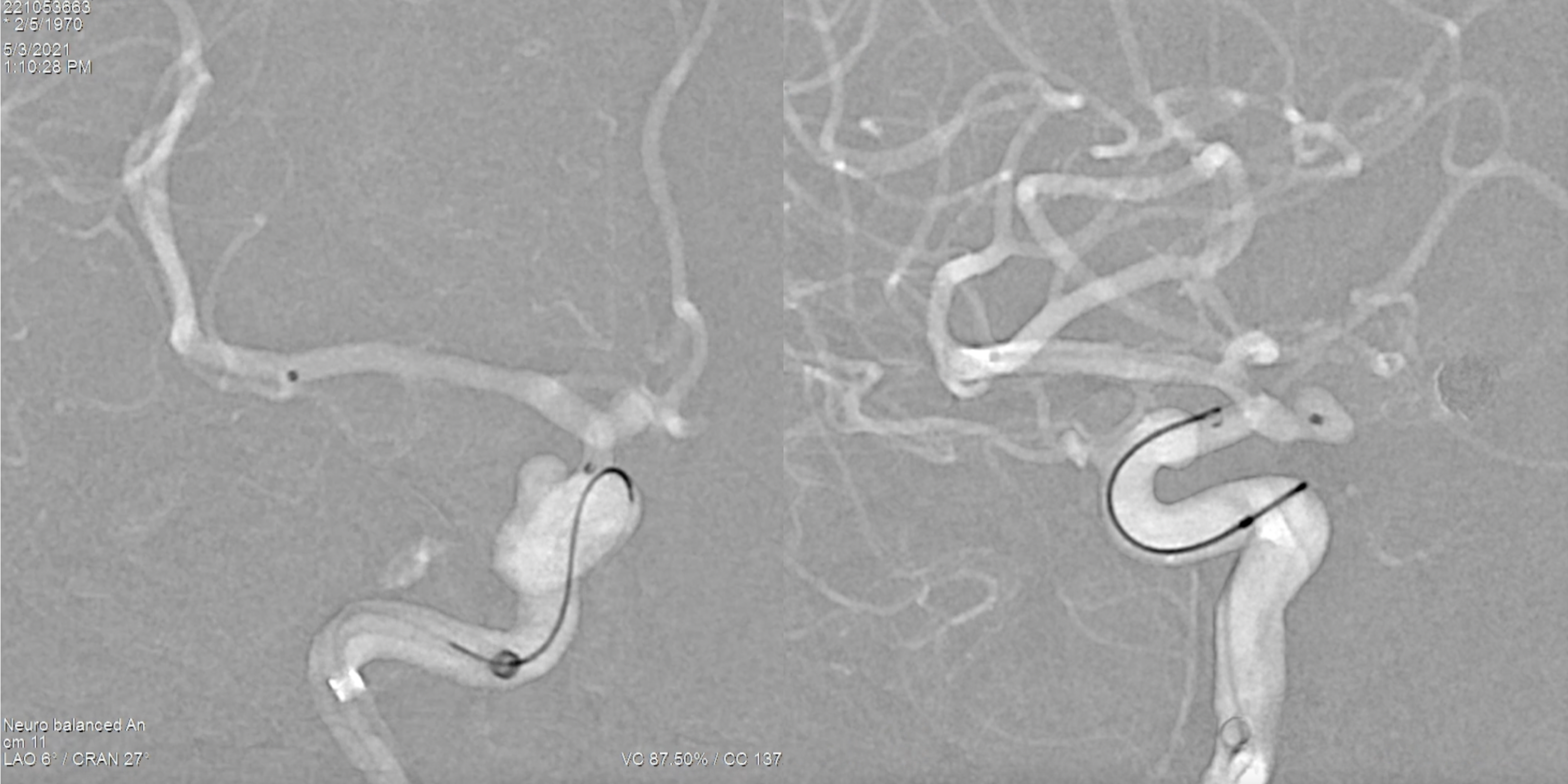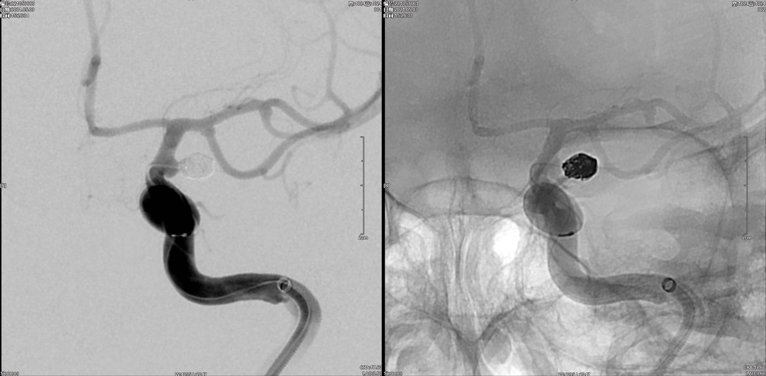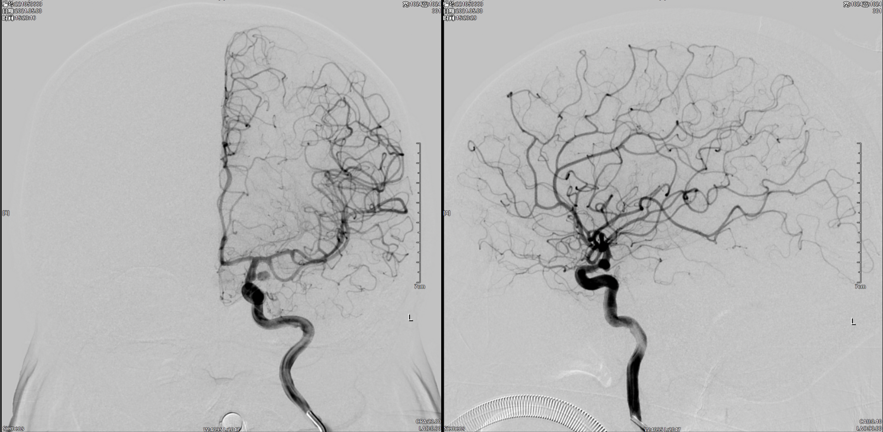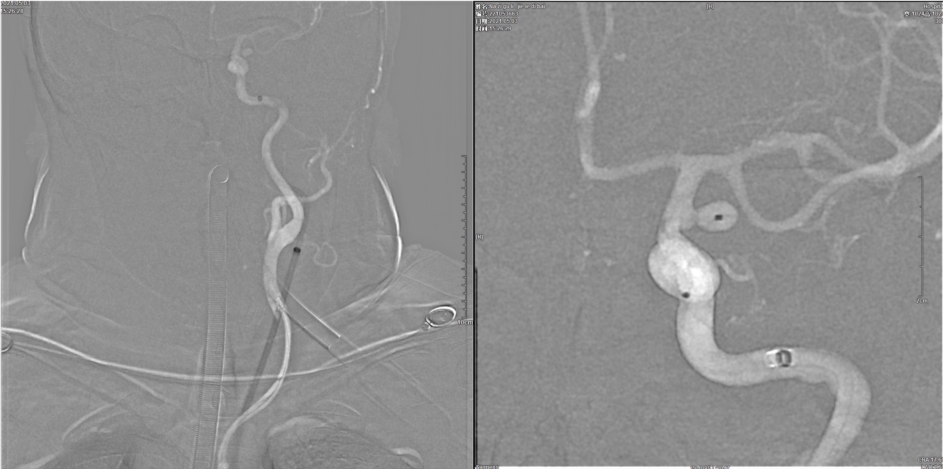术后左侧颈内动脉正侧位造影显示:动脉瘤栓塞完全!各级血管通畅。撤除通路系统。