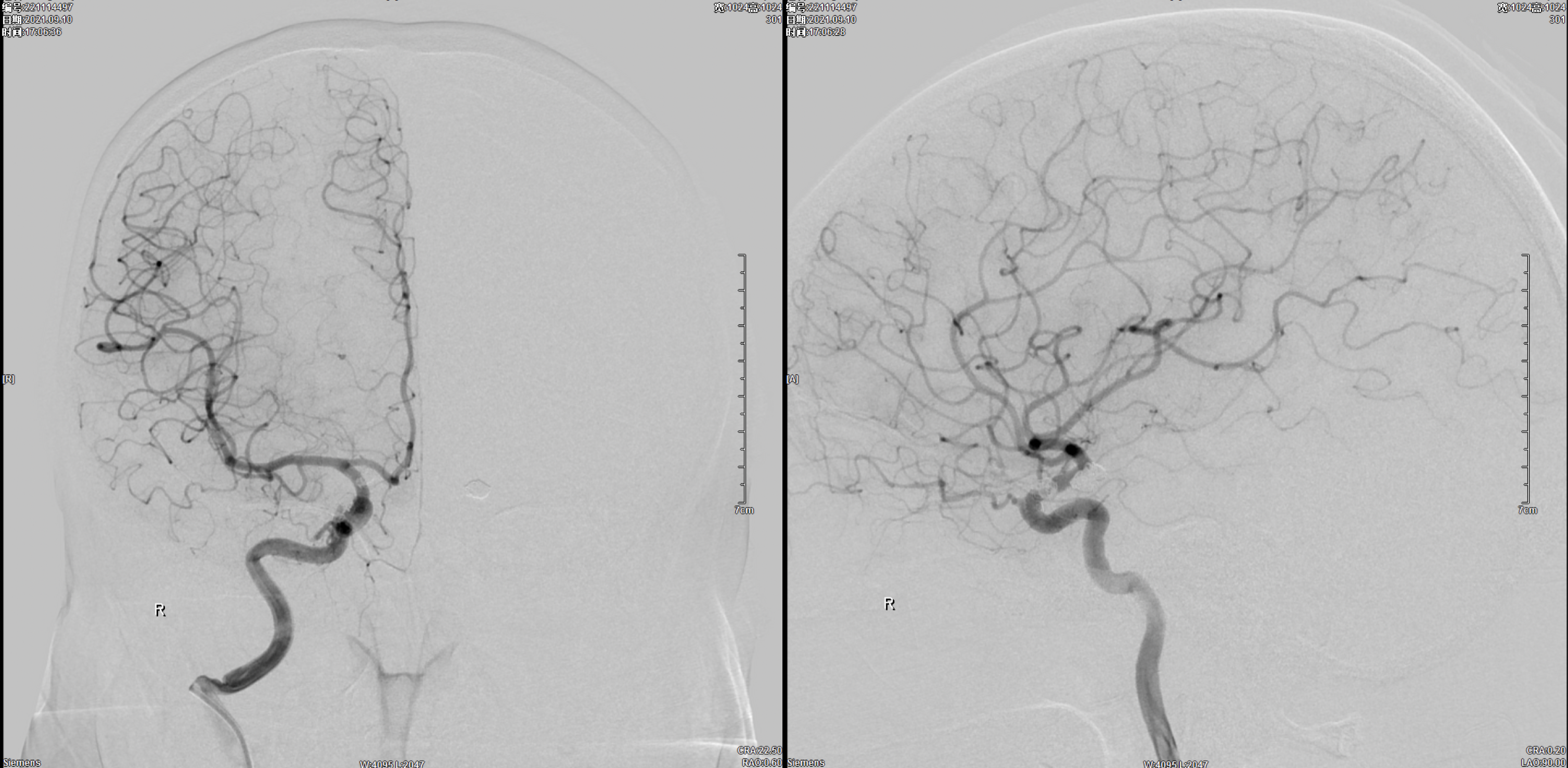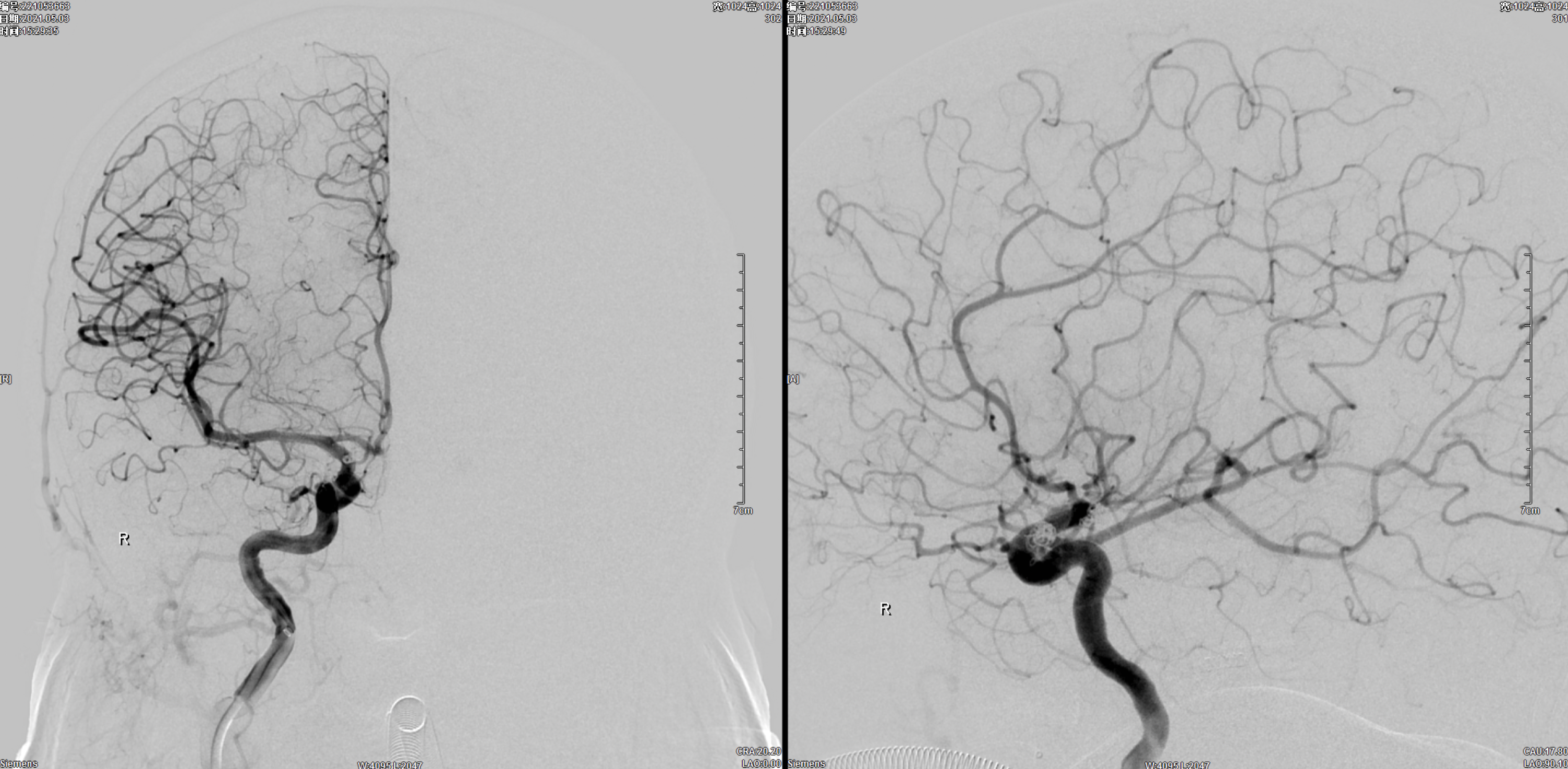 术后右侧颈内动脉正侧位造影:动脉瘤栓塞完全!