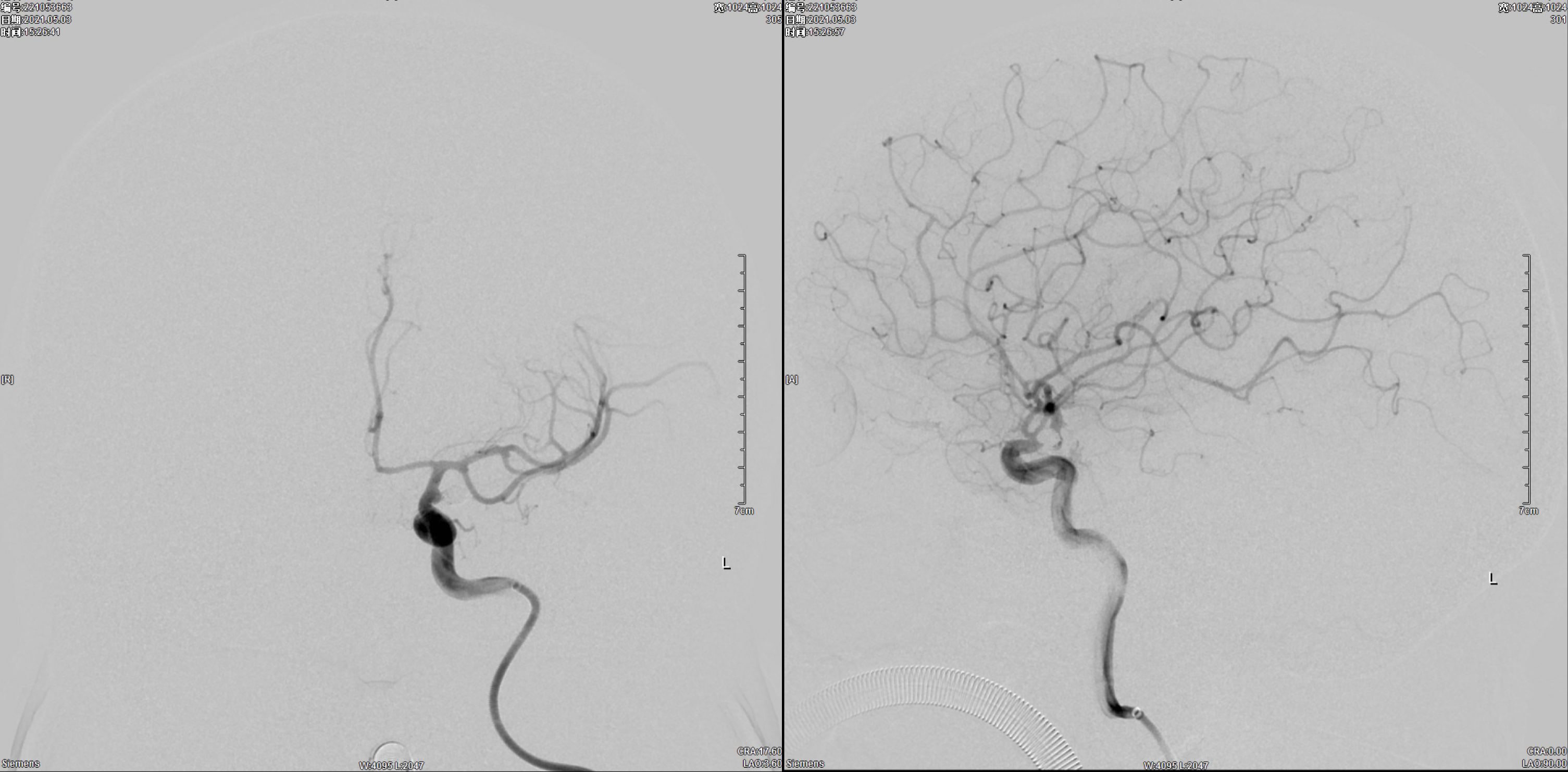 左侧颈内动脉正侧位造影:颈内动脉后交通动脉瘤。