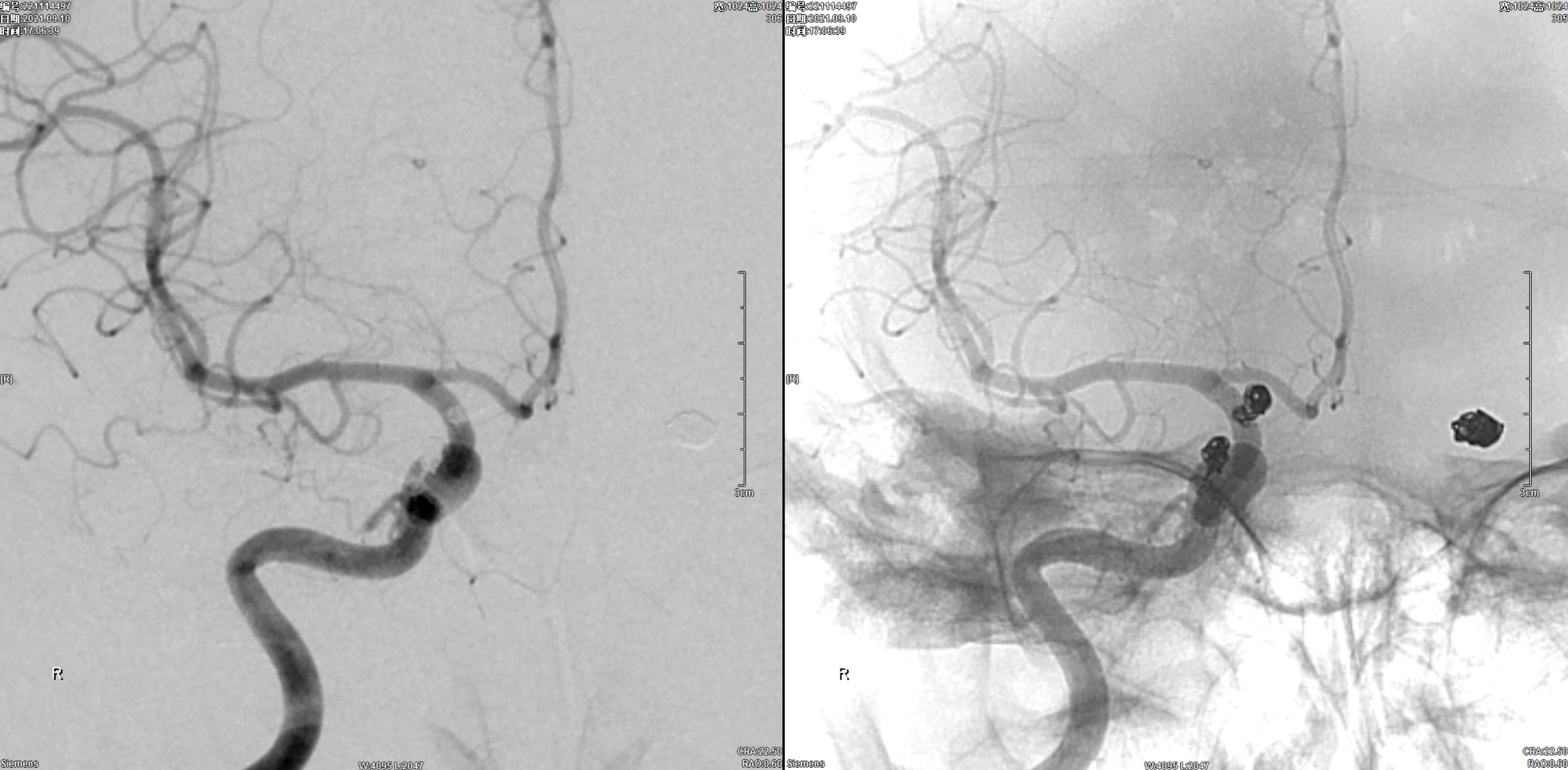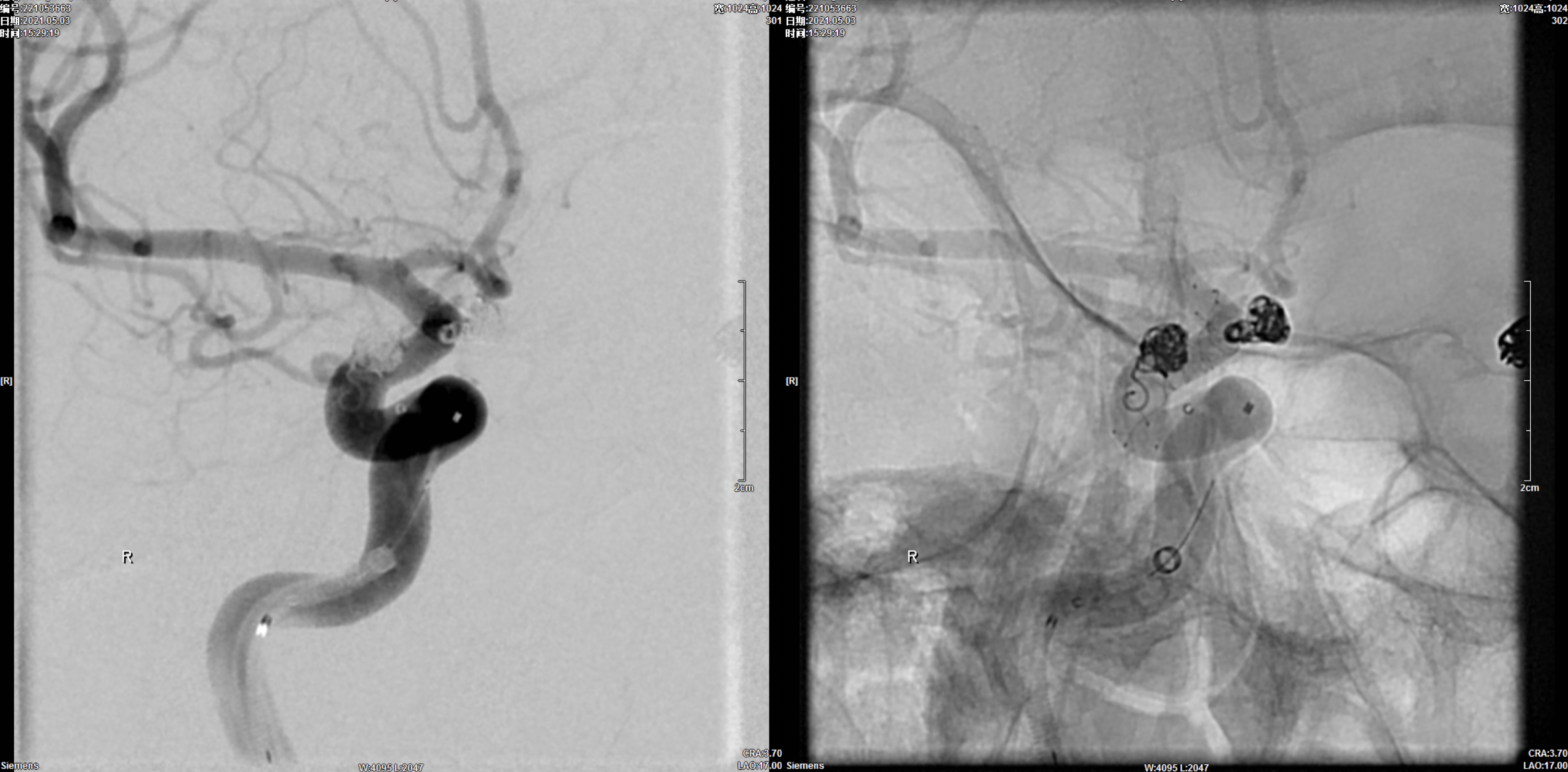 术后3月复查右侧颈内动脉正侧位造影:动脉瘤栓塞满意,未见残留及复发。