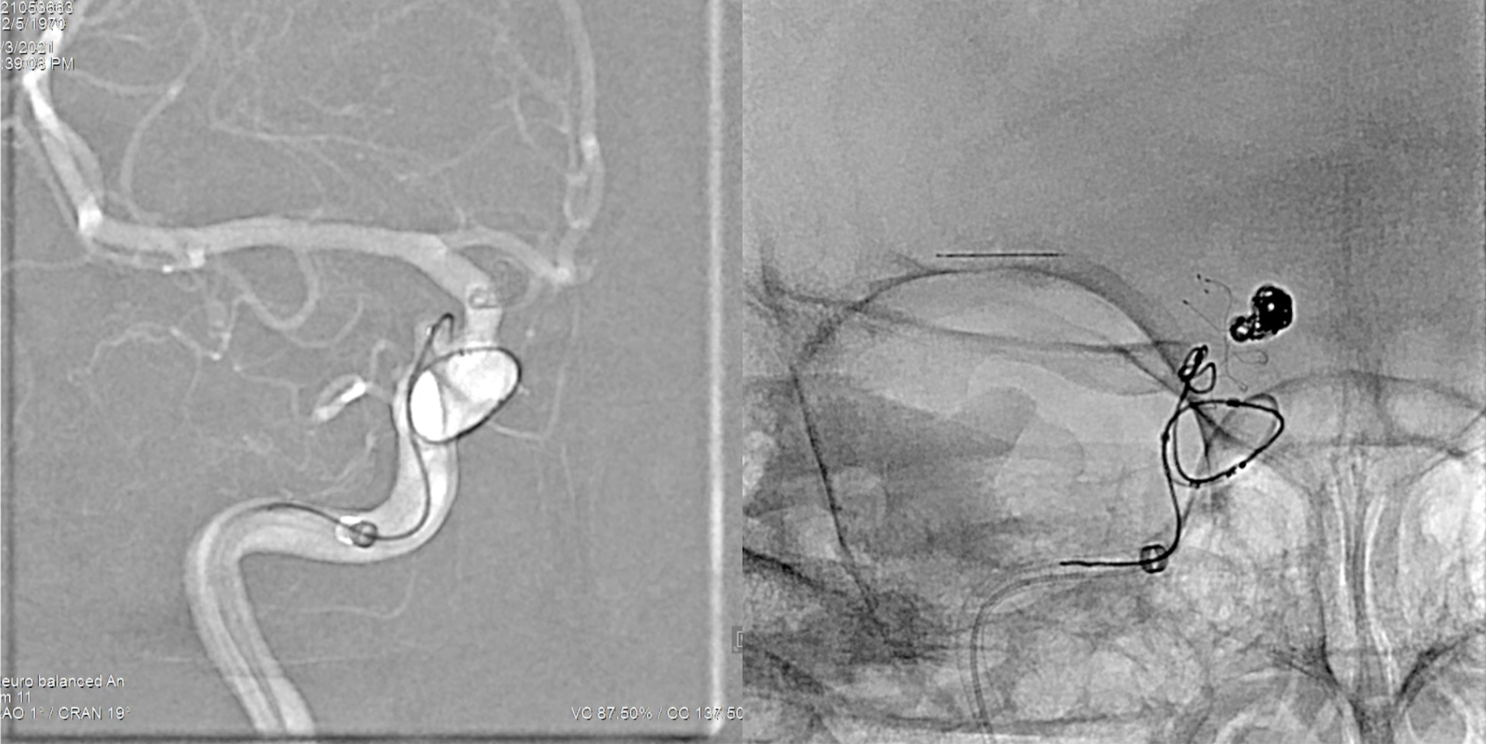 选择Lvis 3.5*20mm支架半释放辅助下先行后交通动脉瘤栓塞,动脉瘤栓塞满意后,撤除栓塞微导管。