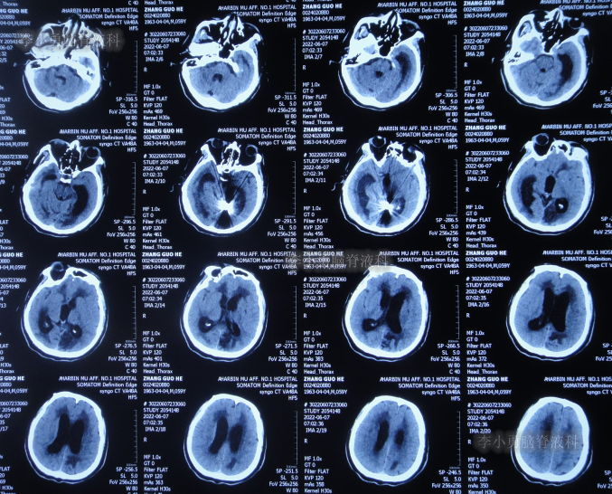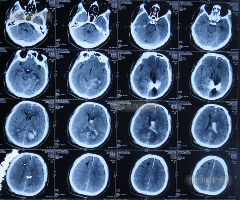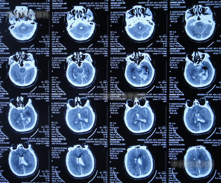 患者于2022年3月16日早晨起床后,无诱因突发头痛,恶心及呕吐,嗜睡,急就诊于当地黑龙江省海伦市某医院,查头颅CT扫描脑出血(片子丢失),因技术有限,120急救车转至上级的黑龙江省哈尔滨某三甲医院,再次复查头颅CT示出血量无明显增多(片子丢失),当天给予脑室外引流术,脑室外引流术后次日查头颅CT示脑出血脑室引流术后(图-1),医生考虑为动脉瘤出血。