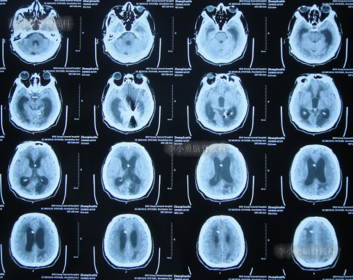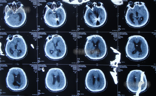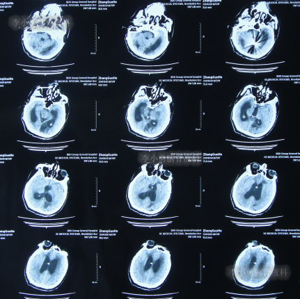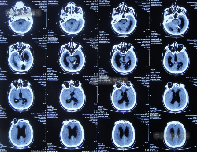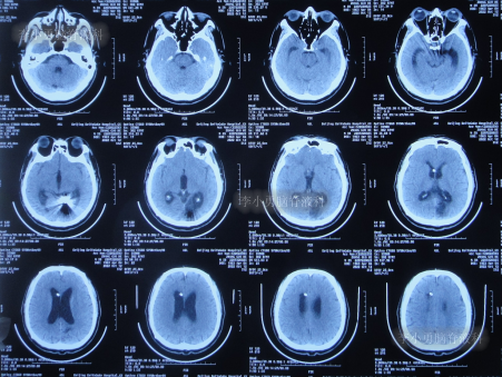 在当地的某医院进行康复治疗1个月的时间,患者症状无改善,期间3次查头颅CT(图-10、图-11、图-12)均示仍脑积水。