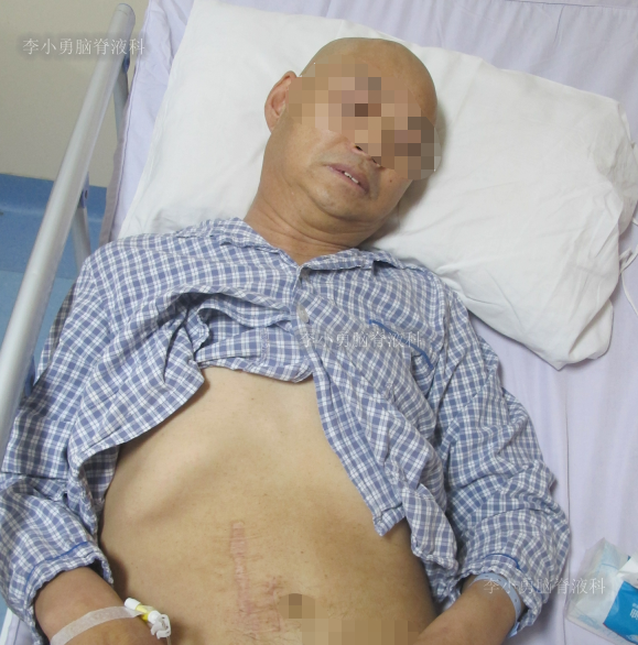2022年7月22日(脑动脉瘤栓塞术后126天,即脑室腹腔分流术40余天仍脑积水)住入李小勇脑脊液科;入院时:意识欠清,时有言语错乱,情感淡漠,小便失禁,坐着自己起不来,搀扶下能站立,但迈不开步,腹部有手术疤痕(图-13)。