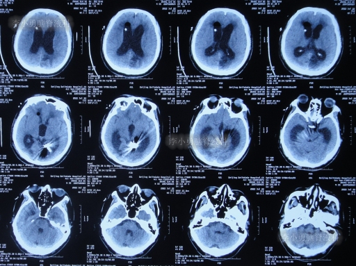 2022年6月13日(脑室腹腔分流术后5天),术后患者仍走路不稳,有时胡言乱语,言语不清,小便失禁,查头颅CT(图-8)示脑室仍有扩张。