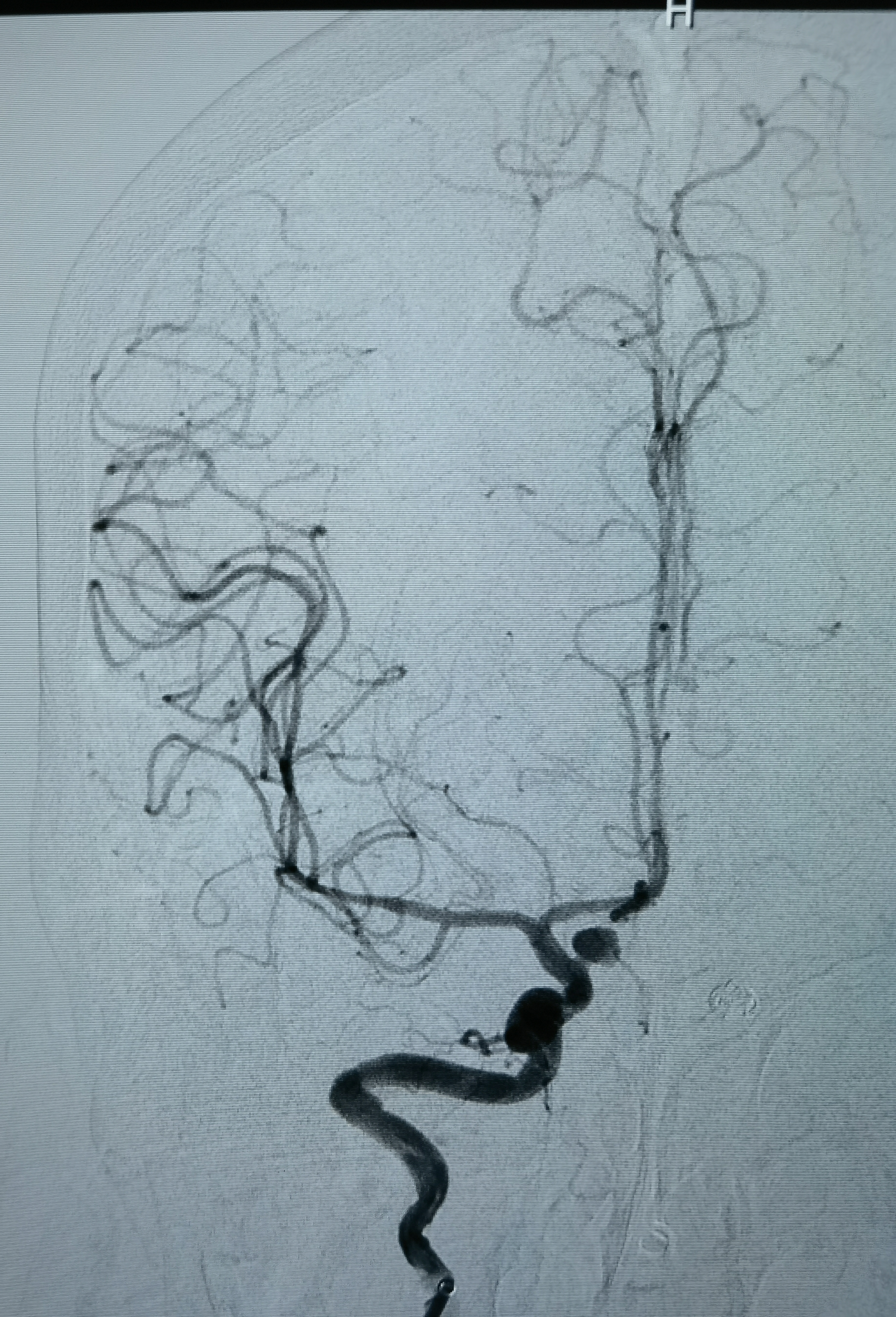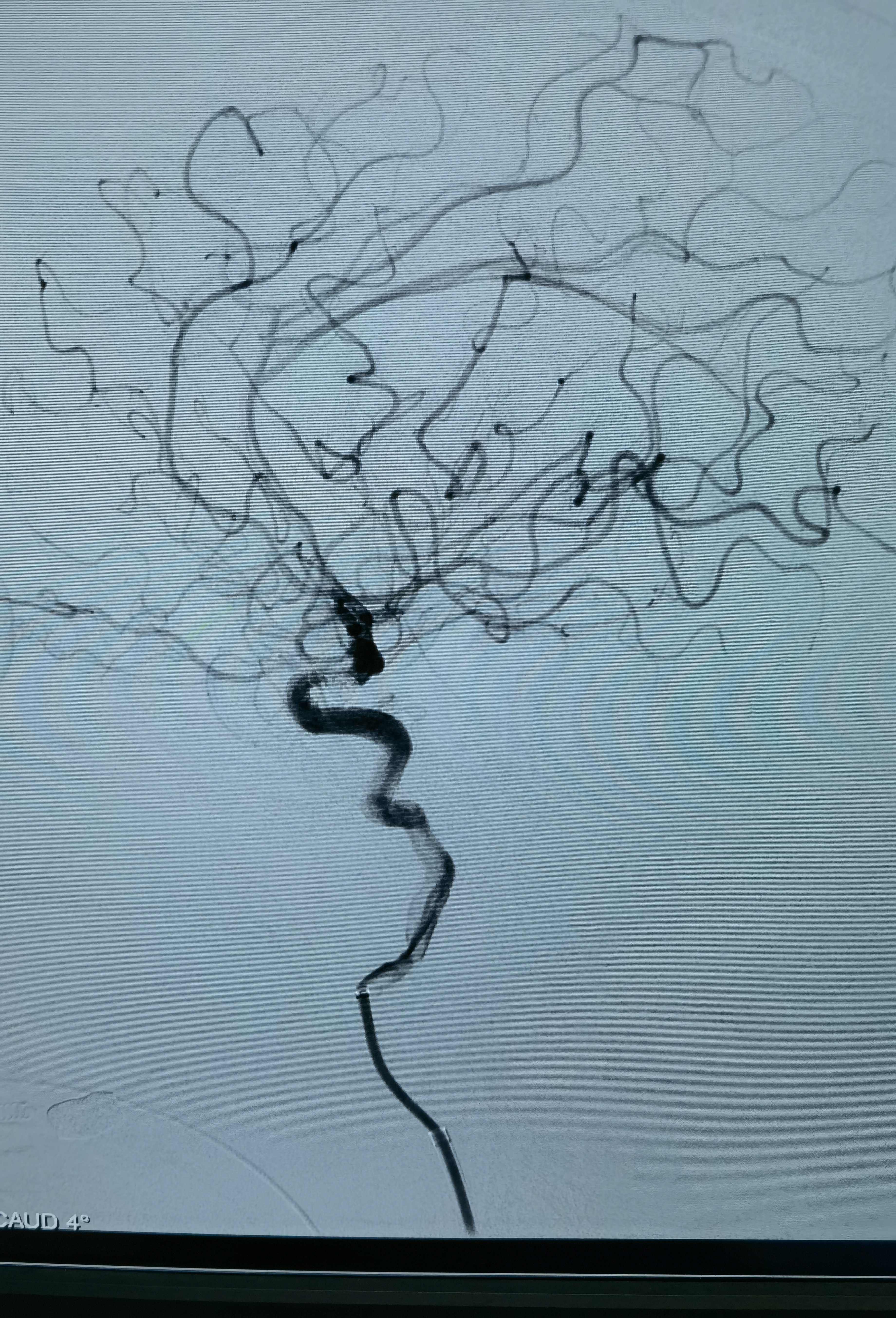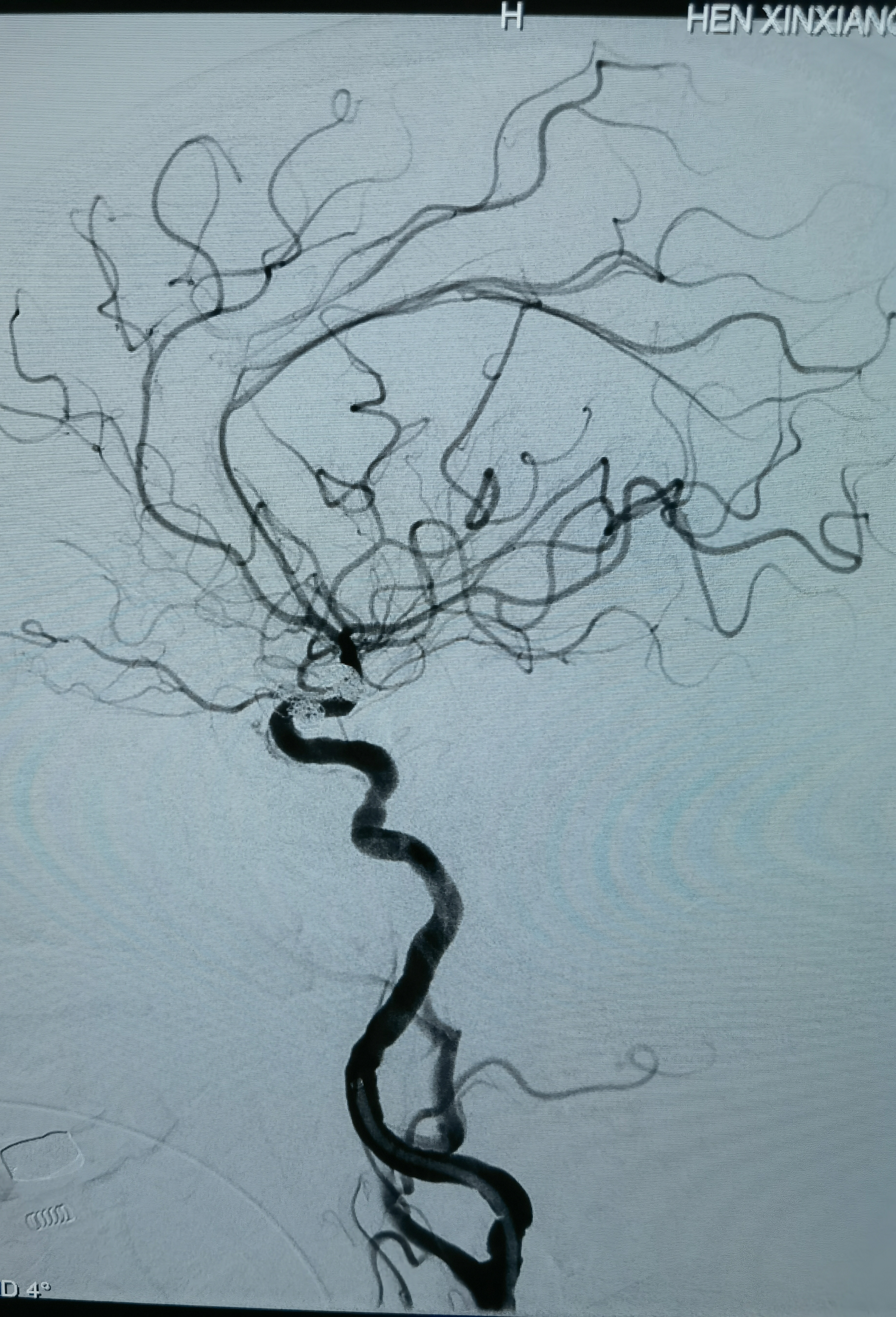 患者女性,70岁,自发性蛛网膜下腔出血入地医院,入院时清醒,Hunt分级2级,当地医学院外请专家手术,术中发现左侧颈内动脉眼动脉段侧壁动脉瘤,大小约4mm,右侧颈内动脉床突上段背侧有一瘤状突起,约1mm,当时把左侧动脉瘤支架辅助栓塞了,术后恢复良好,术后12天患者突发昏迷,紧急气管插管,呼吸弱,呼吸机辅助呼吸,患者深昏迷,复查头颅CT又出血了,还是蛛网膜下腔出血,出血到是不多,家属要求转院治疗,转至我院,入院后患者意识恢复至浅昏迷,留置气管插管,病情稍稳定后行头颈联合CTA提示右侧颈内动脉床突上段动脉瘤,大小约3.4*4mm,至此病史基本明确,患者右侧颈内动脉血泡样动脉瘤,与家属谈话拟手术治疗,患者家属因为对当地医院不满意,有情绪!目前已经花费不少了,且患者还处于昏迷状态,暂时决定不手术,保守治疗。经治疗患者逐渐清醒,再次与患者家属沟通,家属决定手术治疗,不巧正赶上清明节,家属要求过清明节后手术,清明节这天患者突发头痛,短暂昏迷后意识又恢复至模糊,这次家属不再犹豫了,在清明节这天急诊手术了!(中间沟通好多次,反复强调血泡的危险性)。