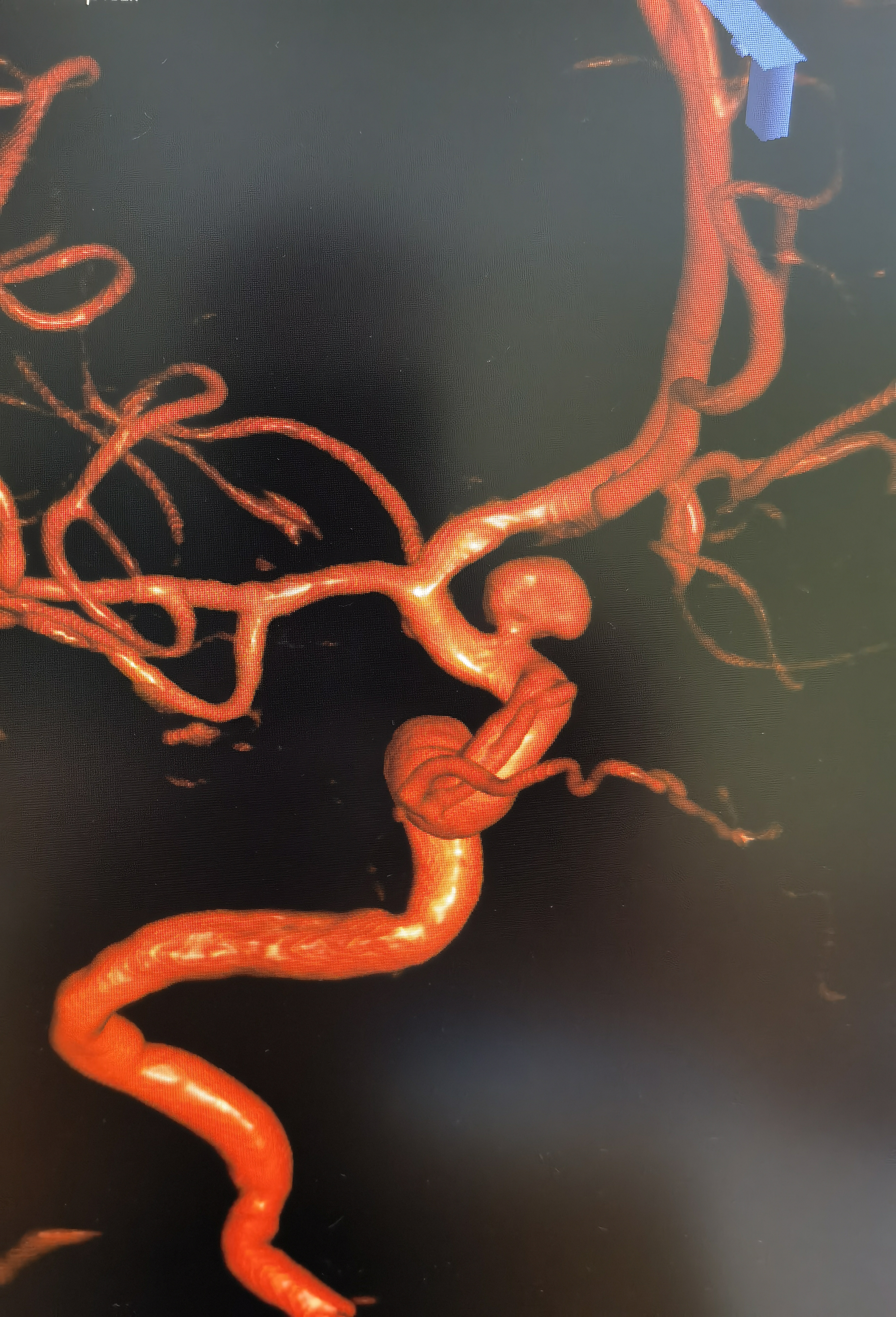 来到我院行CTA检查已经明确右侧颈内动脉血泡样动脉瘤,瘤体增大!