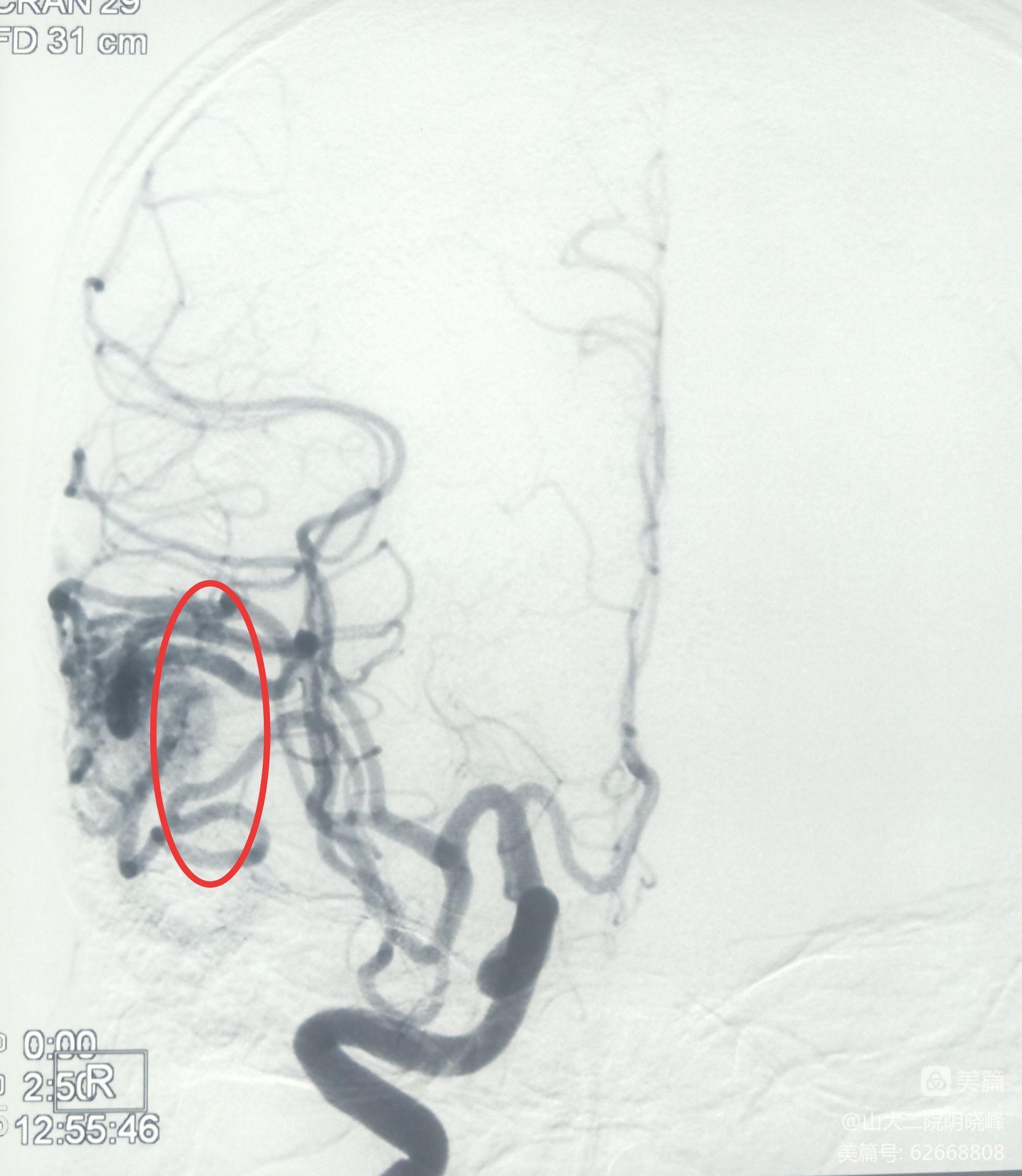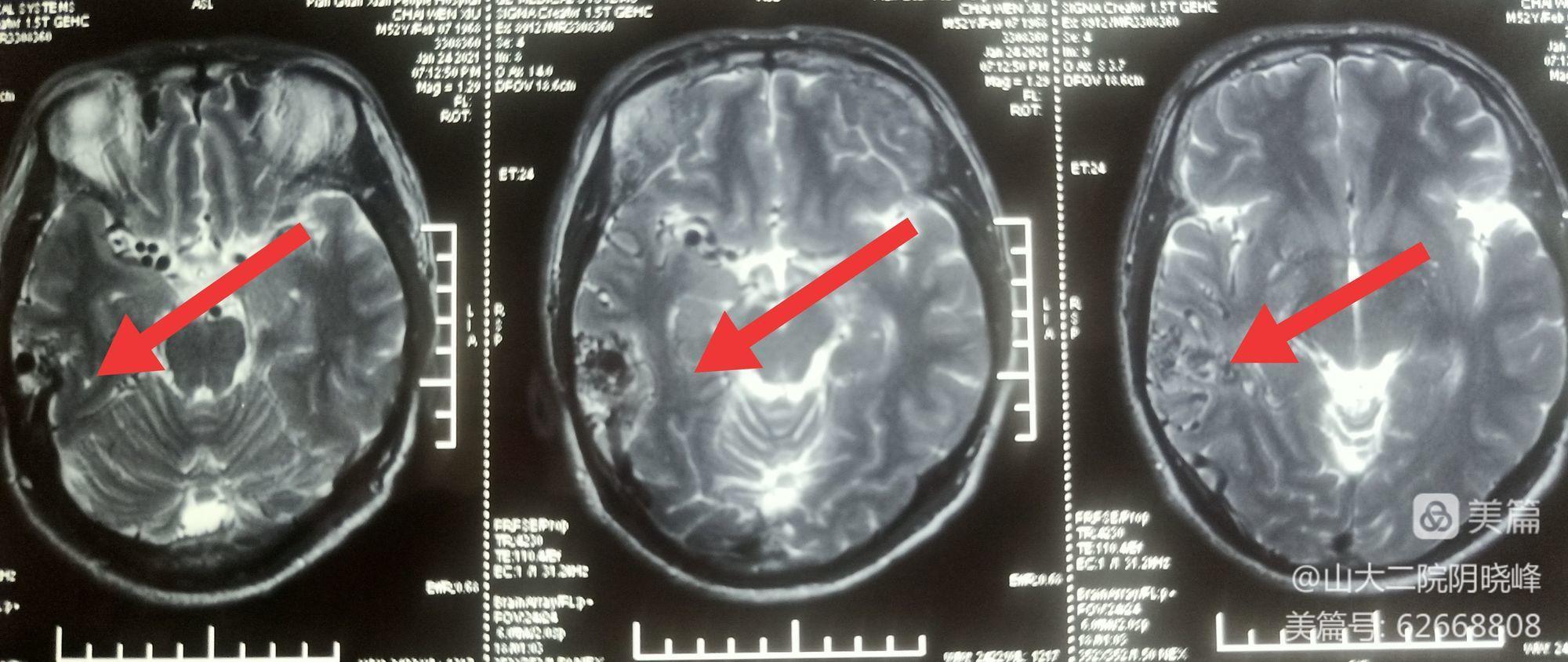 辅助检查:头颅核磁:右侧颞枕交界区可见迂曲流空信号影