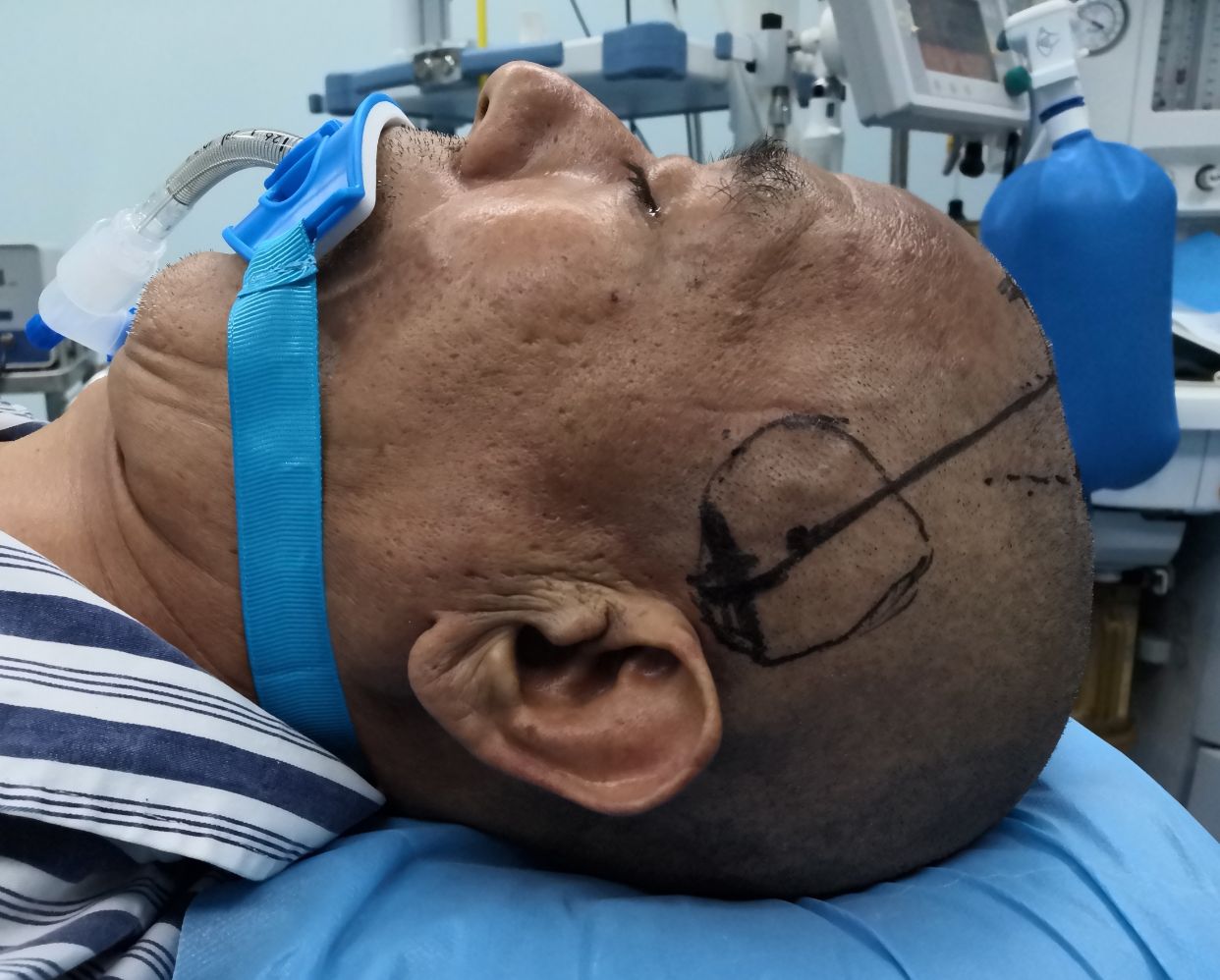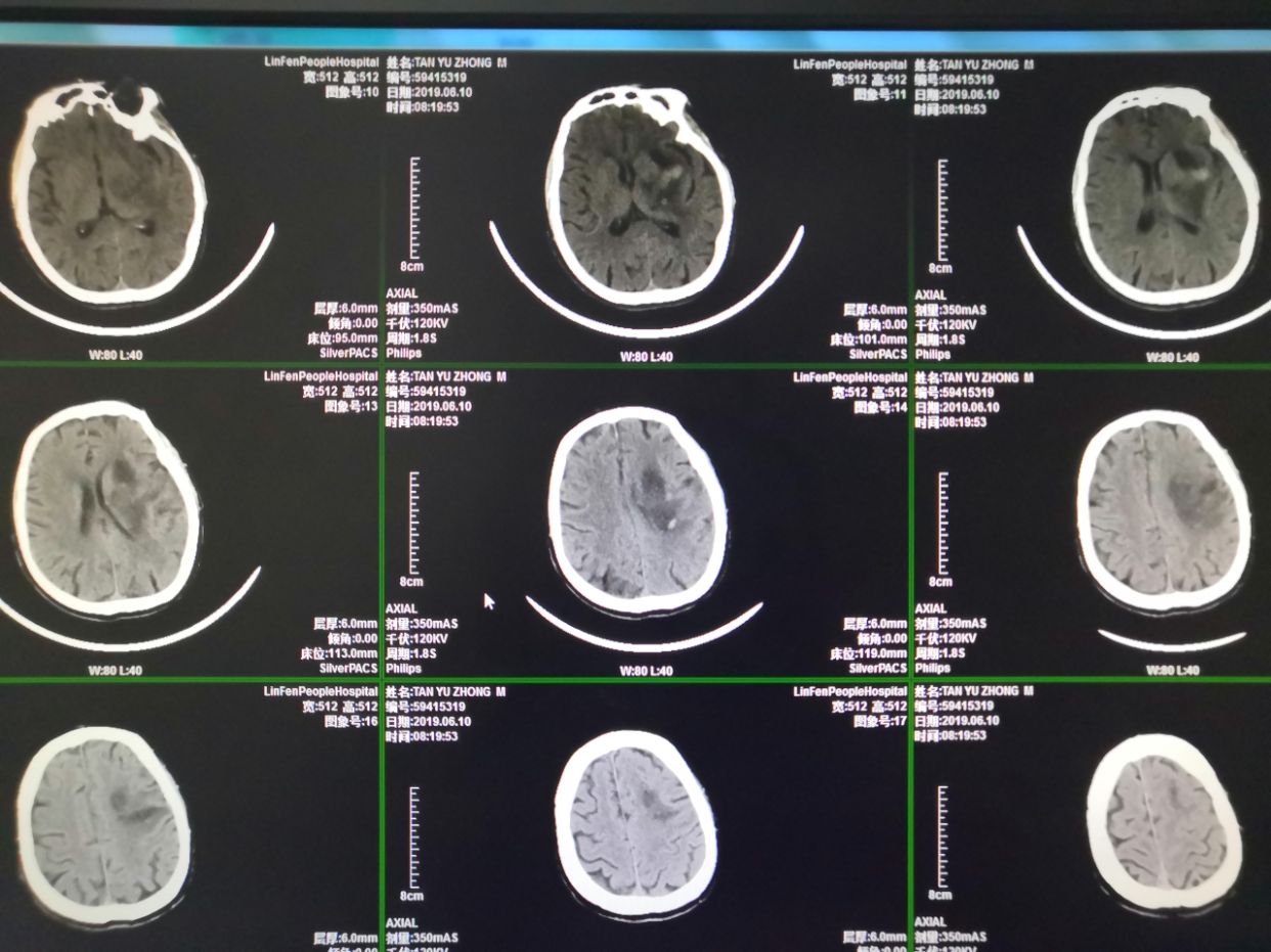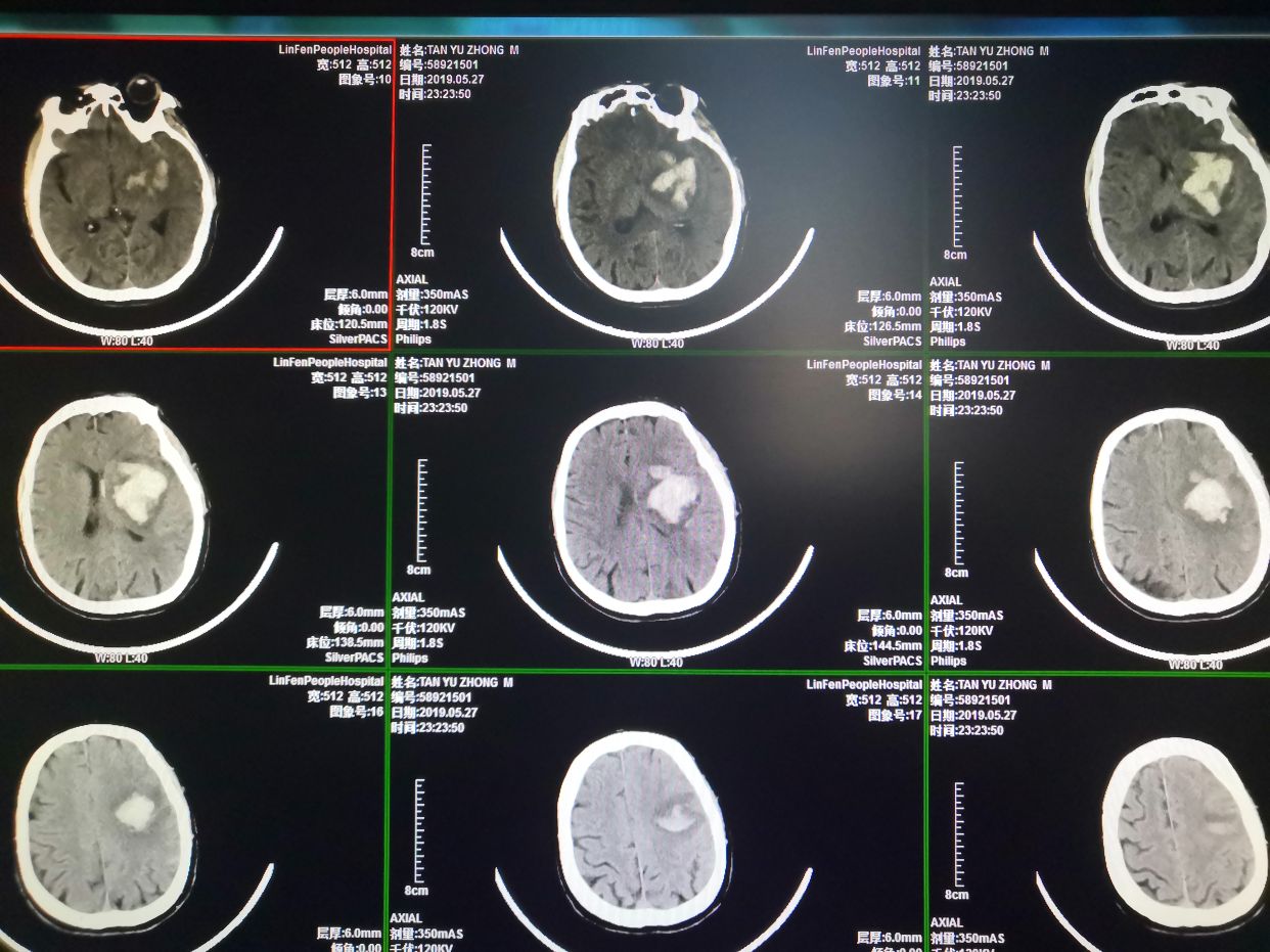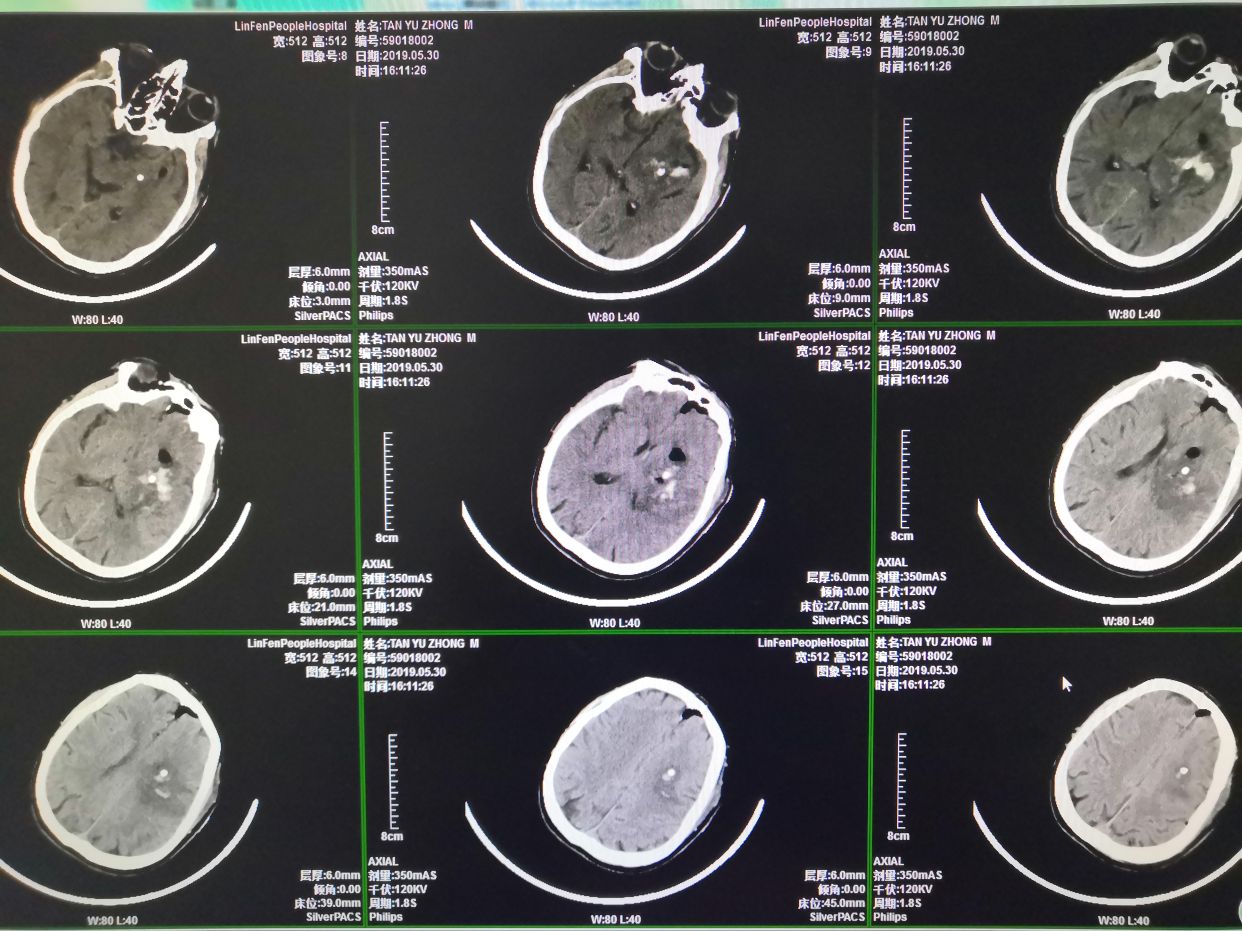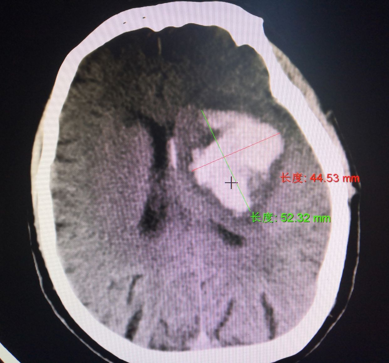 患者男性,主因:“发现意识不清伴右侧肢体无力3小时”急诊入院。患者于入院前3小时被家人发现瘫倒在发上,当时患者意识欠清,言语不能,右侧肢体无力,伴小便失禁,后被120急救后送至当地医院行颅脑CT检查,结果提示:左侧底节区脑出血,转诊至我院,复查颅脑CT后,我科急诊以:“左侧底节区脑出血高血压病3级极高危组”收治入院。查体:血压166/105mmHg,神志嗜睡,呼叫睁眼,失语,可简单遵嘱配合,双侧瞳孔等大圆,约2.5m,对光反射迟钝,口角向左侧轻度歪斜,左侧肢体肌力4级,右侧肢体肌力0级,肌张力下降,右侧肢体腱反射减弱,右侧巴氏征(+)。颅脑CT左侧底节区脑出血。诊断左侧底节区脑出血,高血压病三级极高危。
