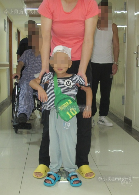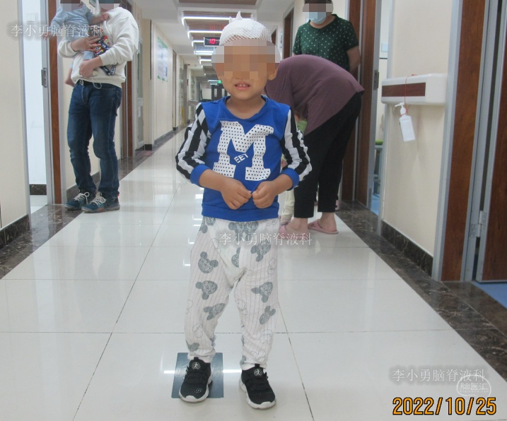 入院治疗25天即2022年7月25日,家长扶着两个胳膊能自己迈步,膝盖变得能弯曲(图-13);次日按计划进行了脑室腹壁外引流术。