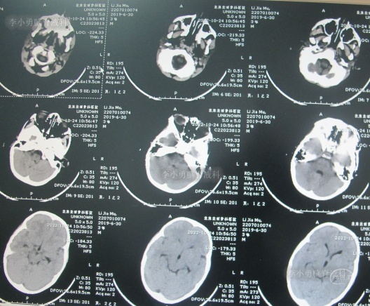 2022年10月25日(李小勇脑脊液科治疗117天),出院时:精神状态挺好,大小便正常,虽右腿走路稍差但走路速度变快,变稳(图-19);出院时头颅CT示未见异常(图-20)。