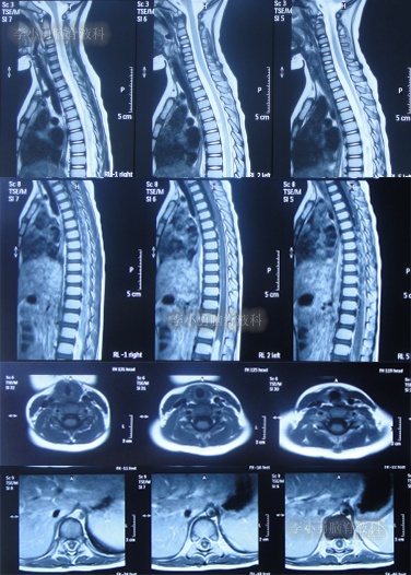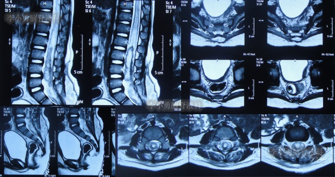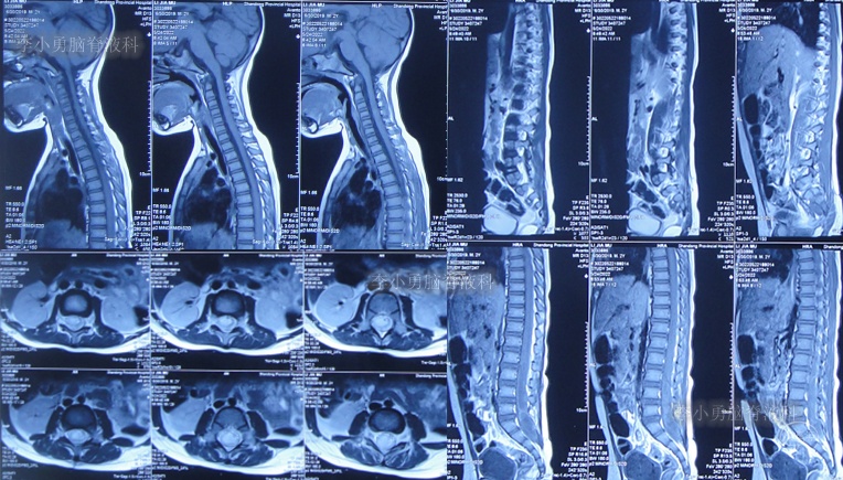 该院治疗11天期间,体温变正常,期间两次查脊髓核磁(图-4、图-5)示脊髓栓系松解术后。