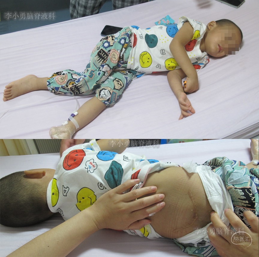 2022年7月1日(脊髓栓系松解术2年,间断发热1月余,脑室进行性扩张3周)住入李小勇脑脊液科,入院时:精神差,痛苦面容,右腿活动差不能走路,大小便可感知但控制不住,后腰下方骶骨部有手术疤痕(图-7)。