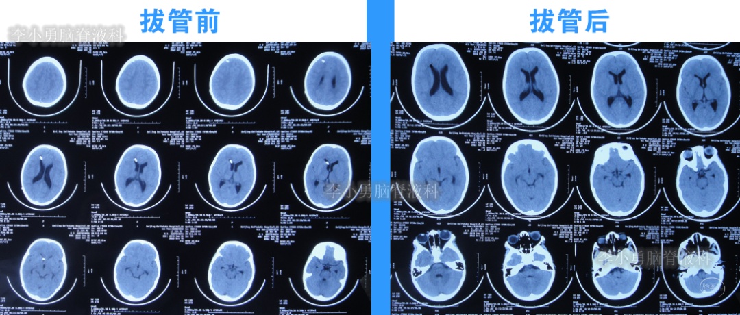 2022年10月19日(住院治疗111天),拔除了脑室引流术,拔管前和拔管后头颅CT(图-18)对比。