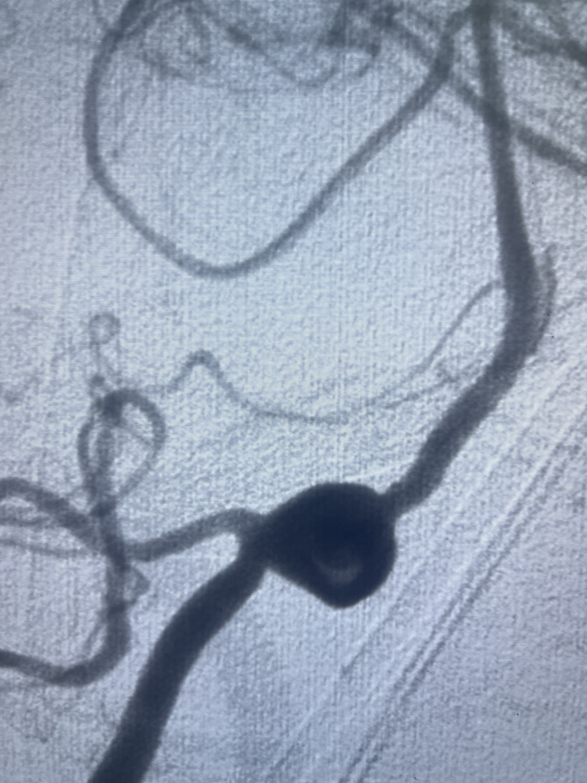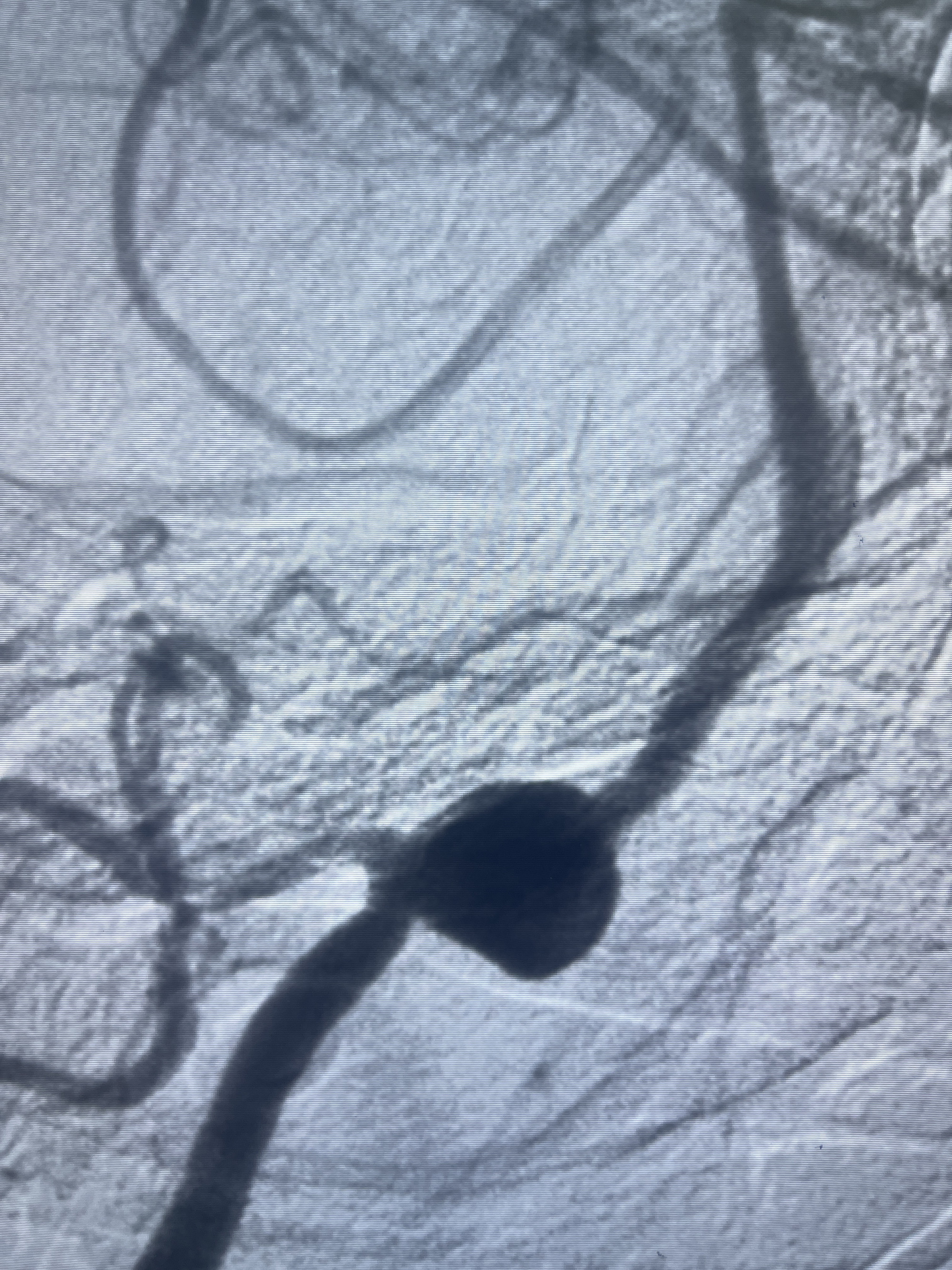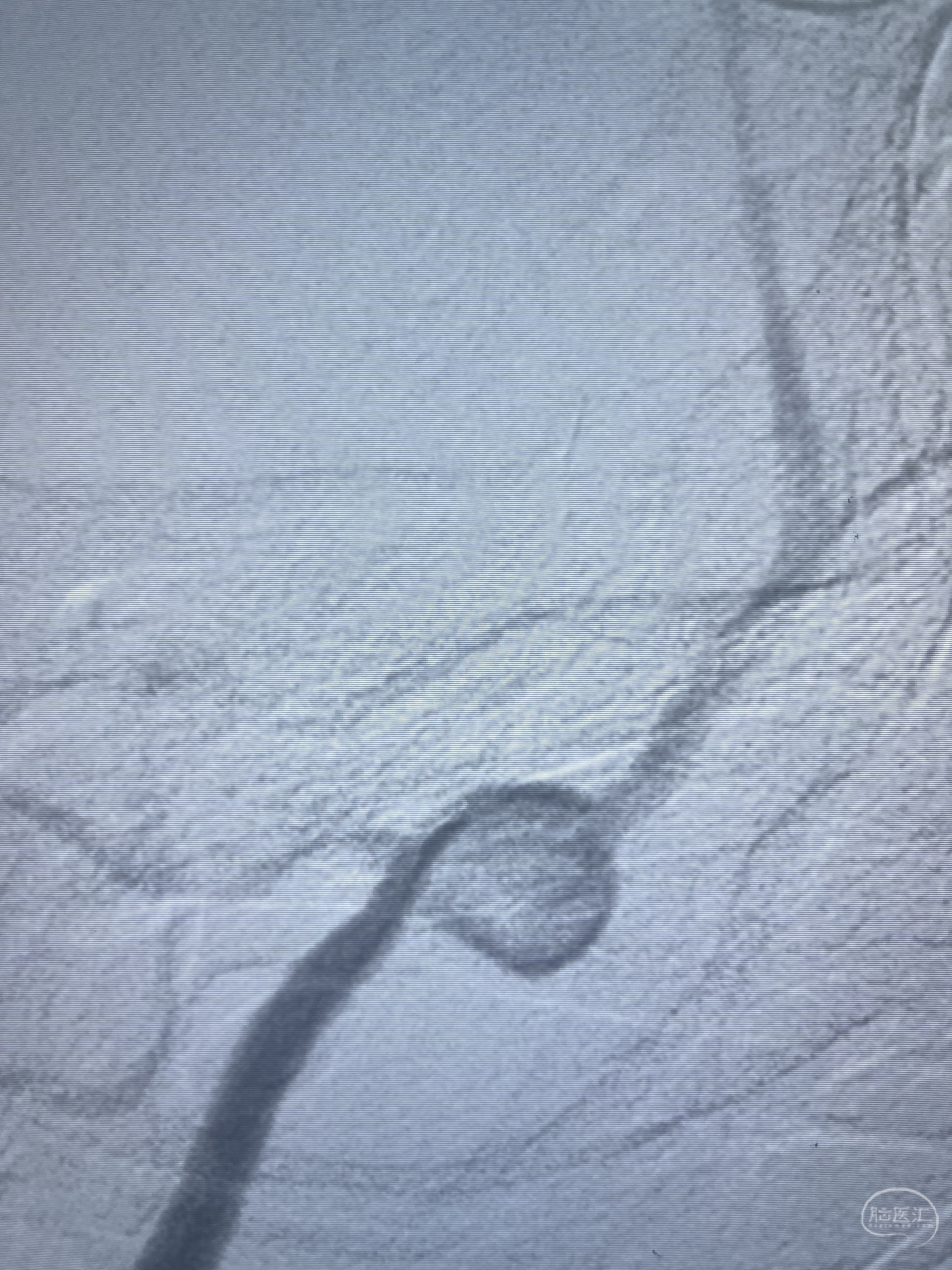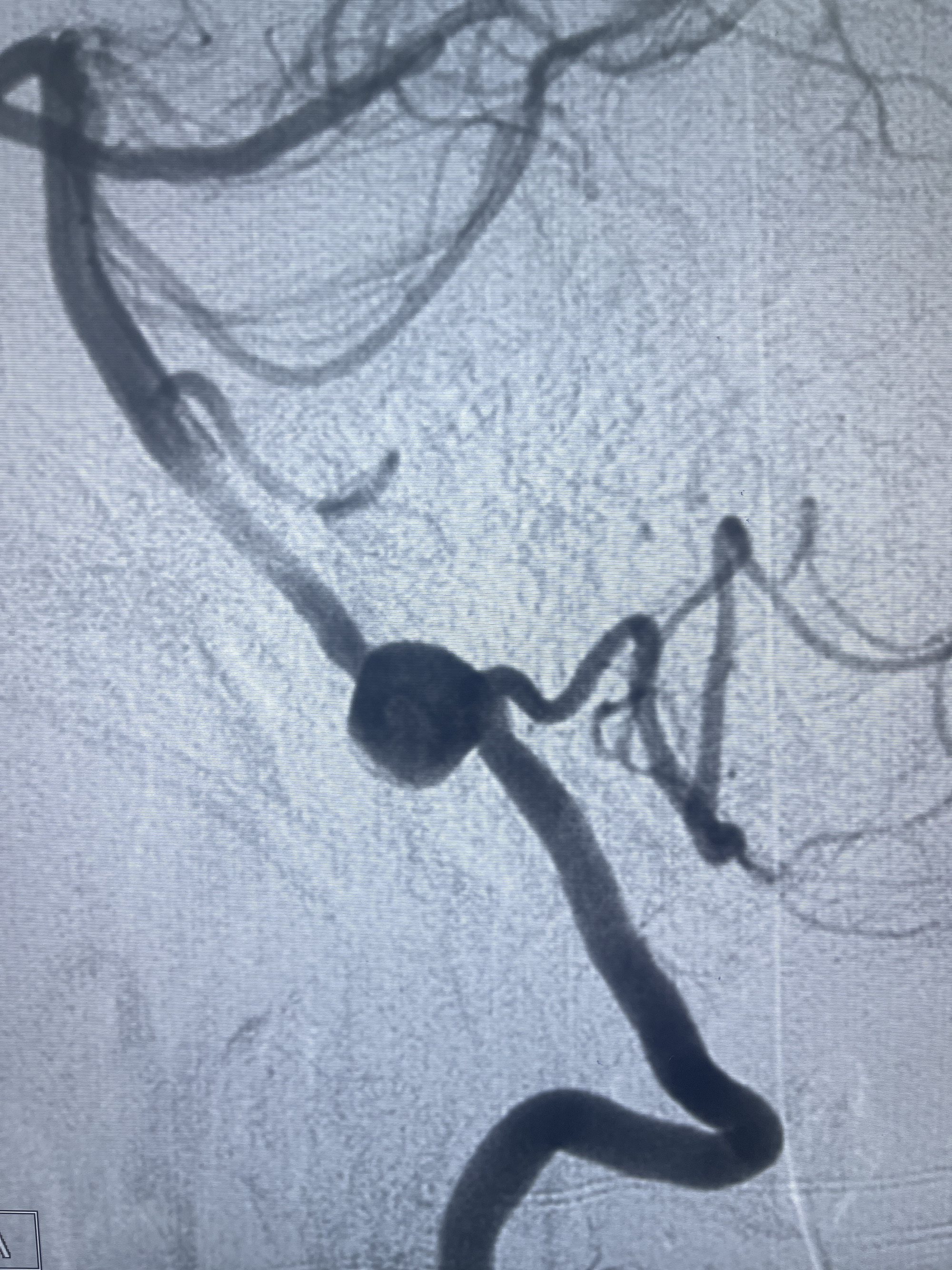 202.04.28脑血管造影:右侧大脑后动脉远段闭塞,右侧椎动脉V4段可见“囊状造影剂填充影”,大小7.64*7.65mm,可见PICA由动脉瘤发出;