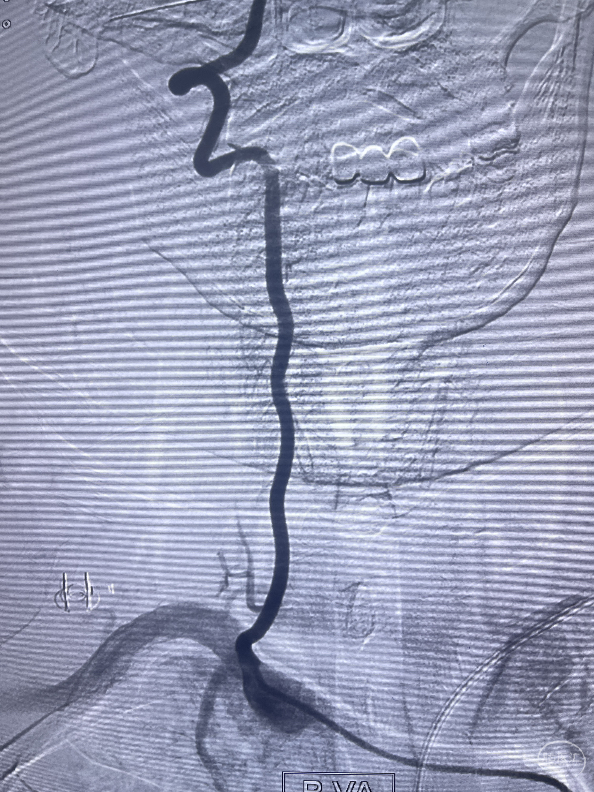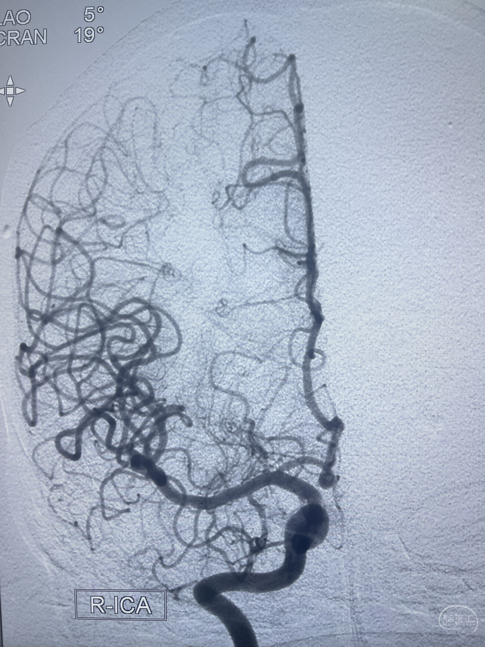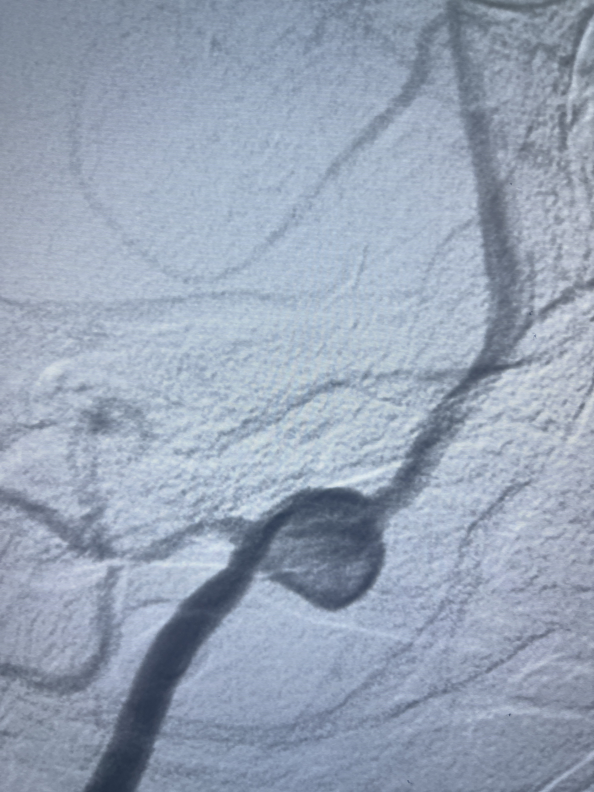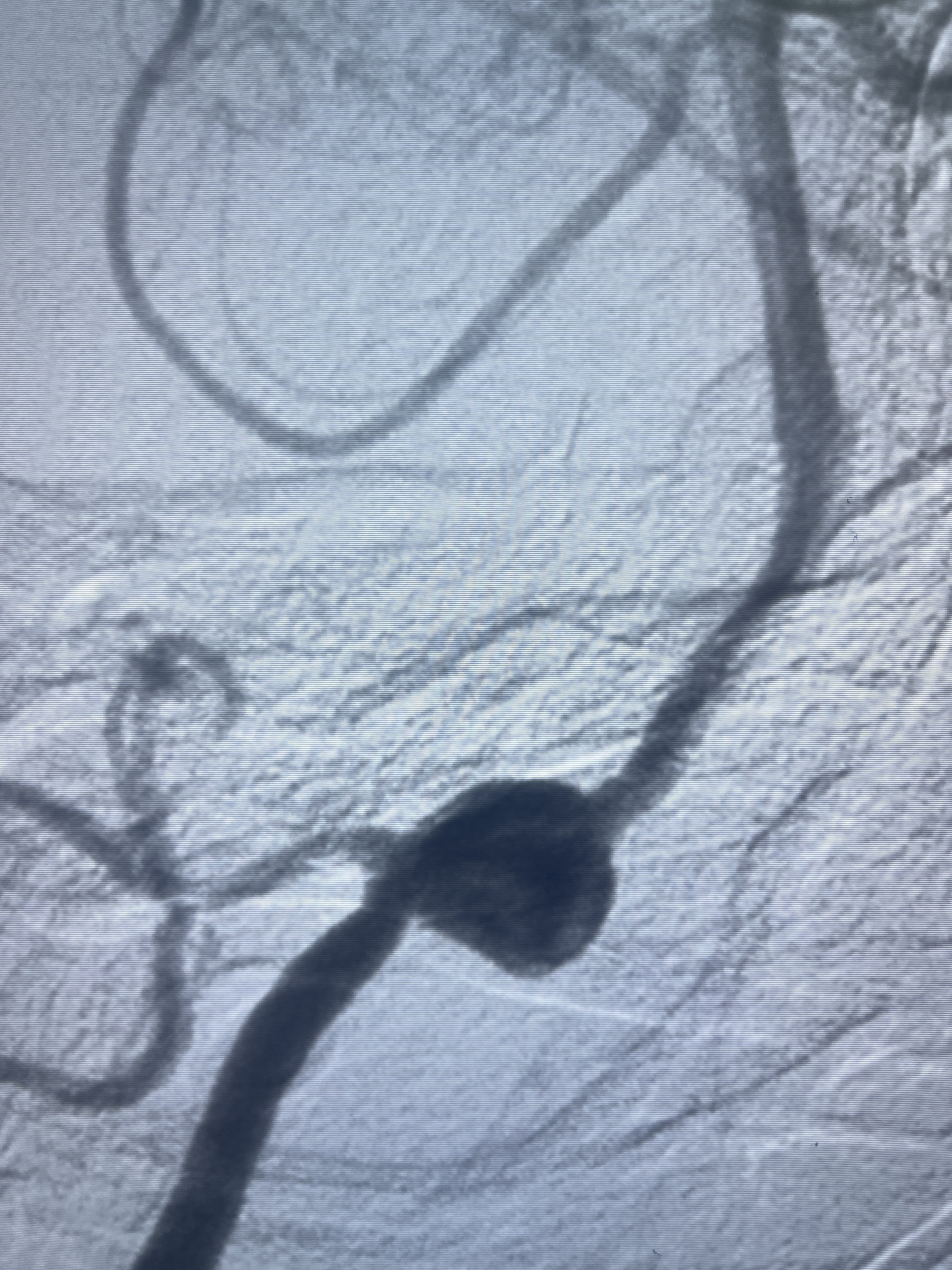 202.04.28脑血管造影:右侧大脑后动脉远段闭塞,右侧椎动脉V4段可见“囊状造影剂填充影”,大小7.64*7.65mm,可见PICA由动脉瘤发出;