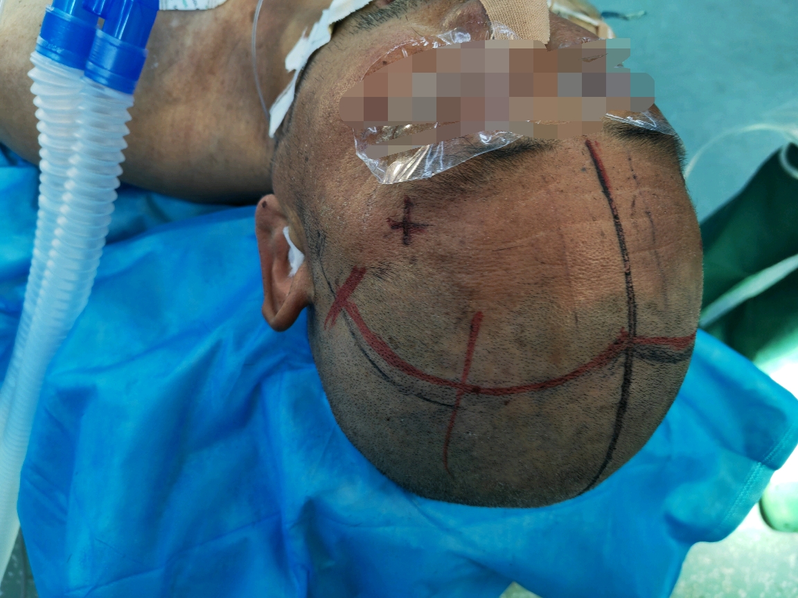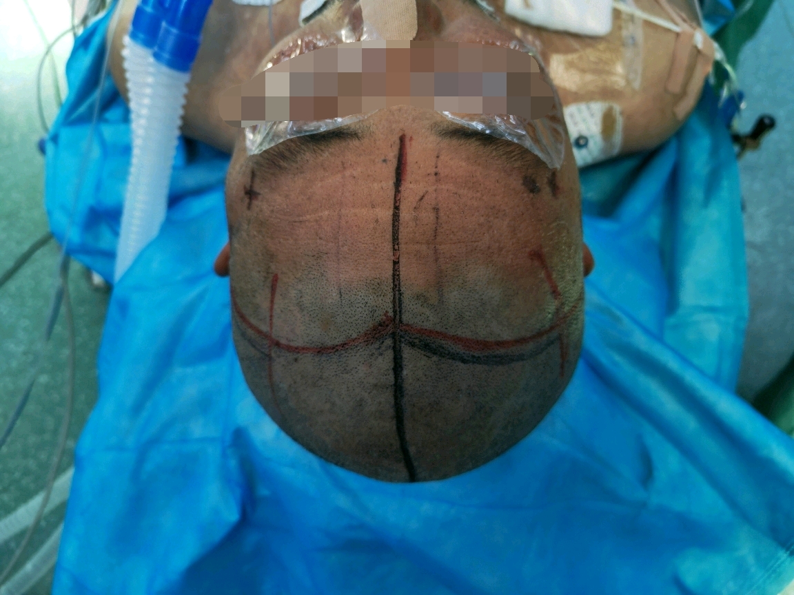 设计双侧冠瓣切口,前额发际线内1cm,自额颧点平面发际内,弧形向上、前,跨中线至对侧。考虑扩大骨窗可能,给予发际线内1.5cm切口