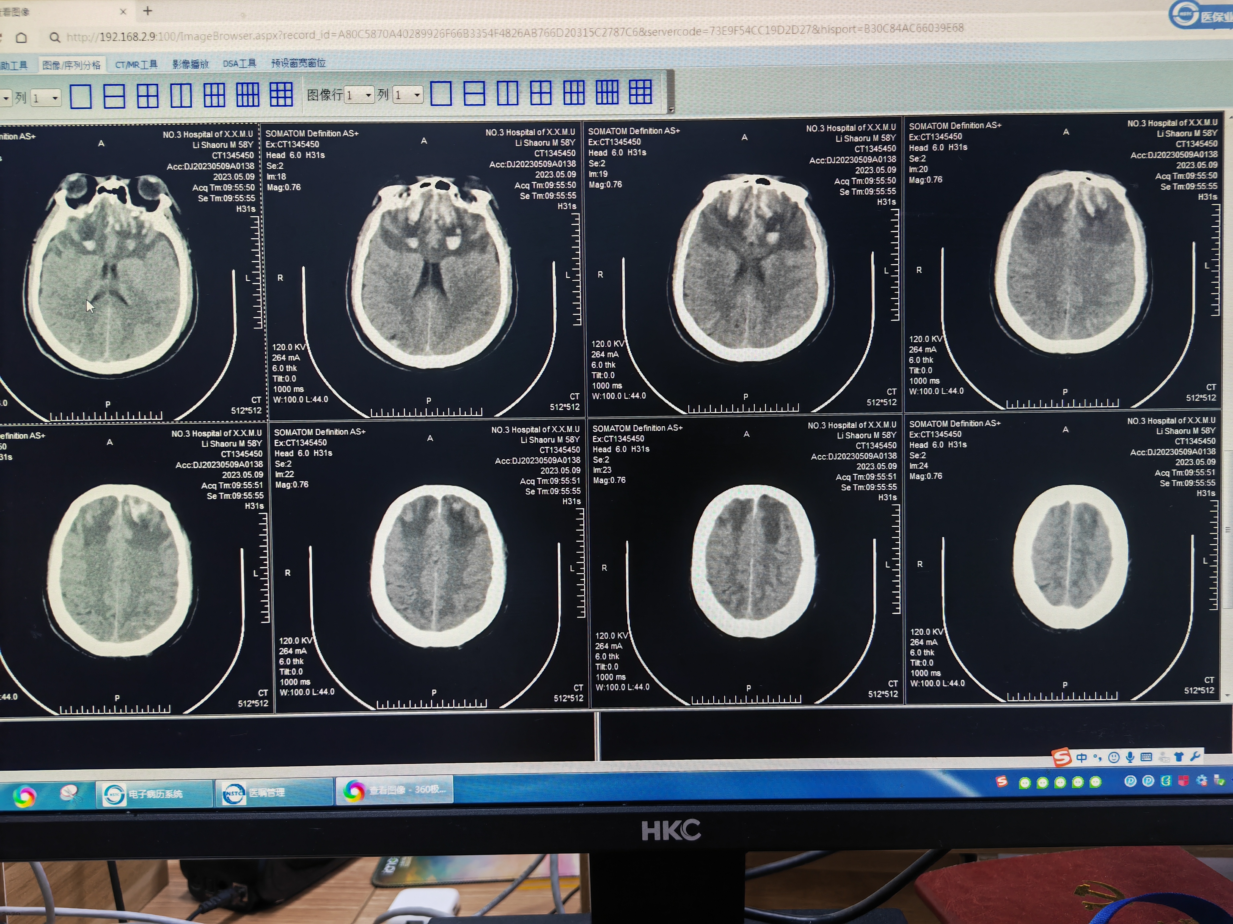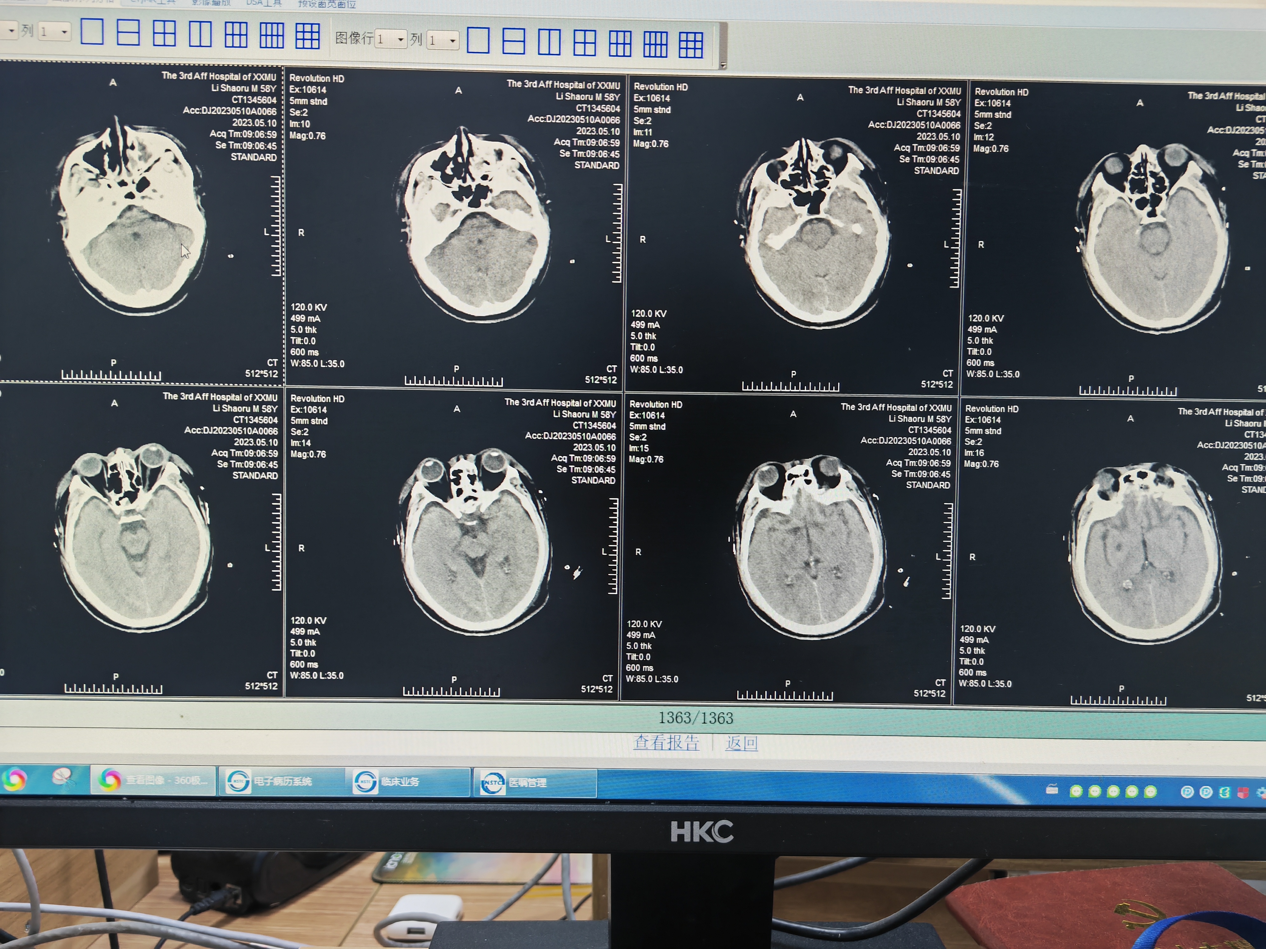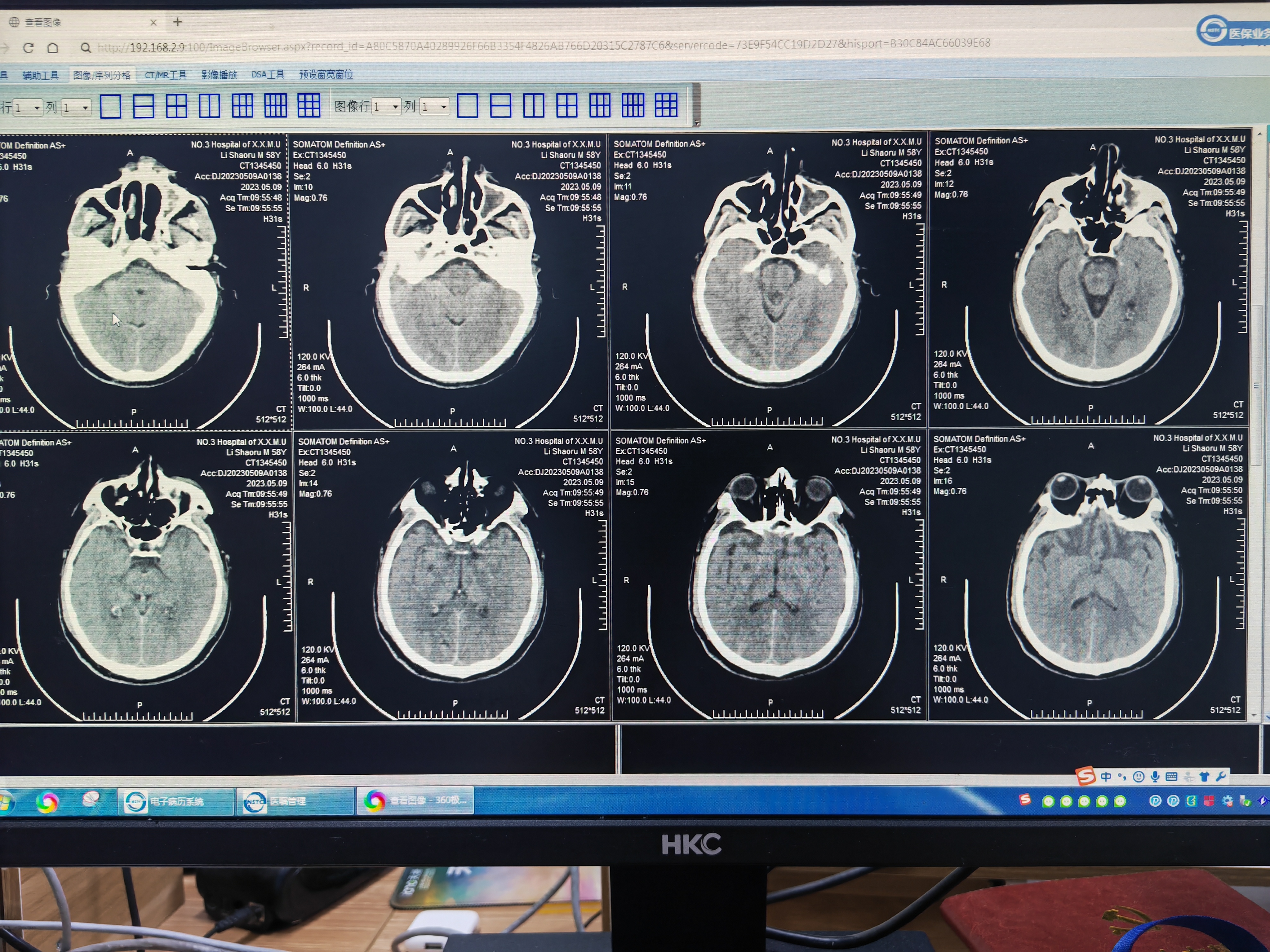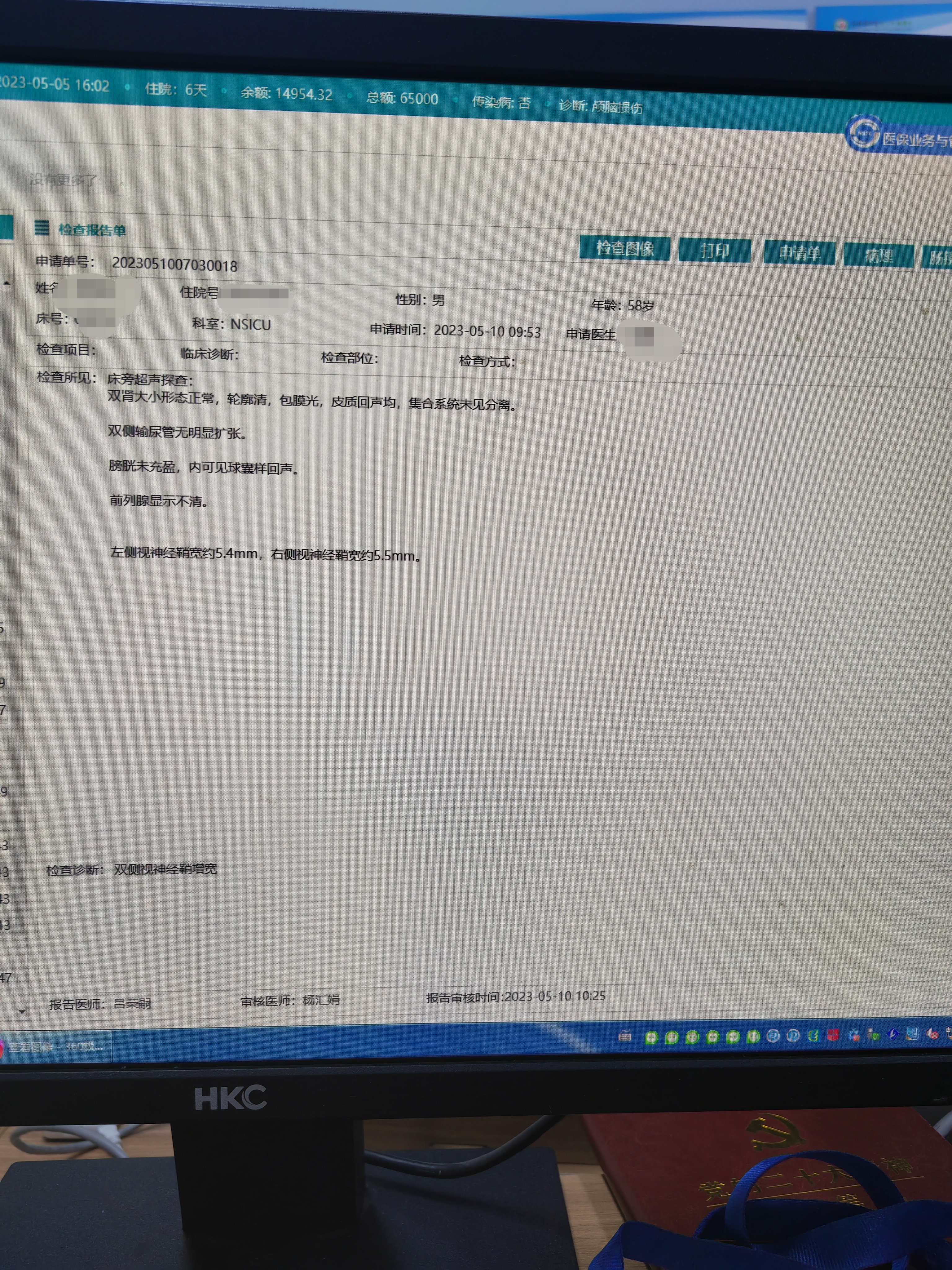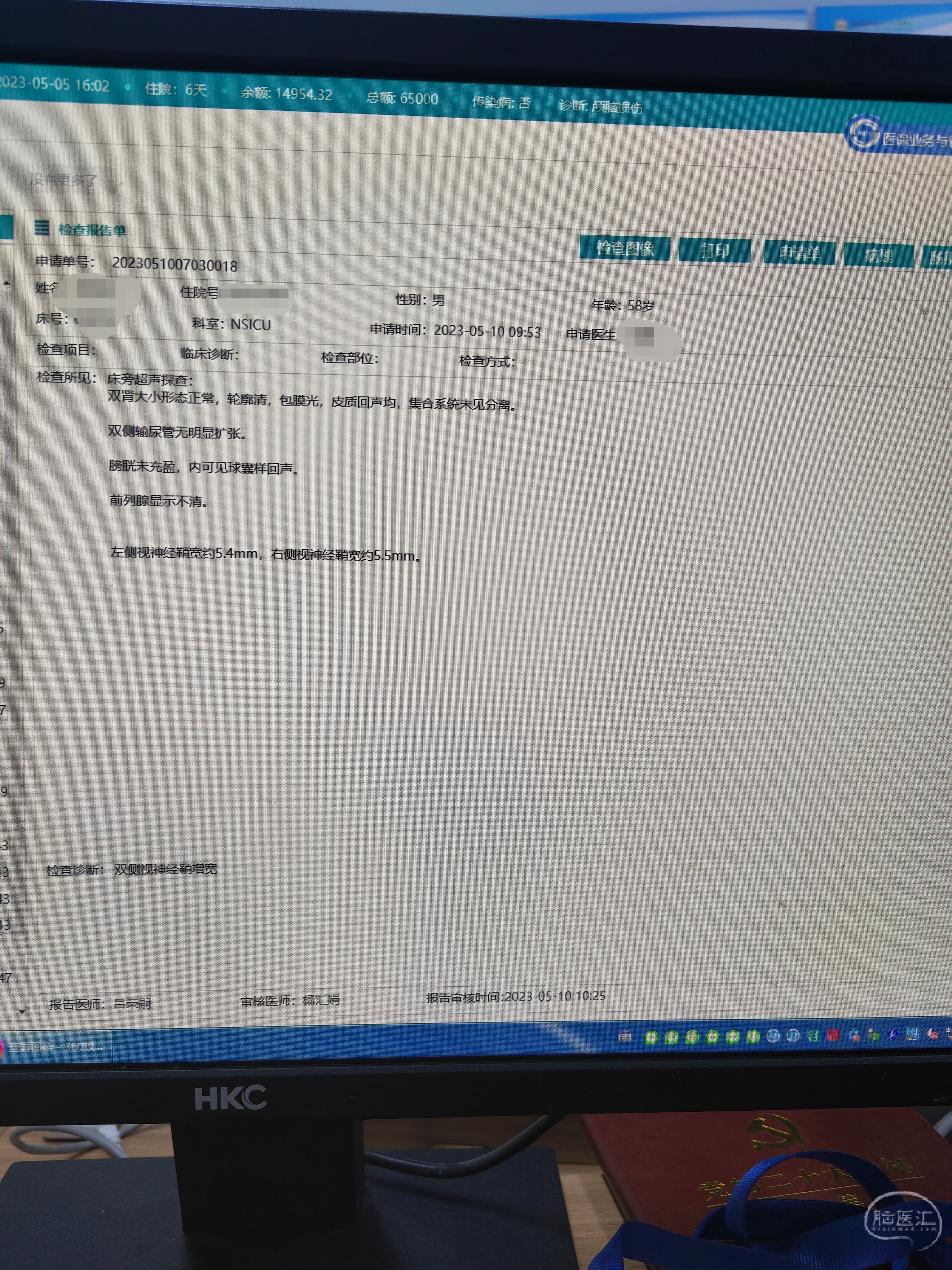 给予甘油果糖40ml/h持续泵入,给予呋塞米40mg q8应用,给予白蛋白应用。脱水治疗,家属拒绝应用颅内压监测,期间定期复查CT,定期检测视神经鞘直径。保守治疗4天见患者视神经鞘直径增宽,考虑颅压高,给予复查CT