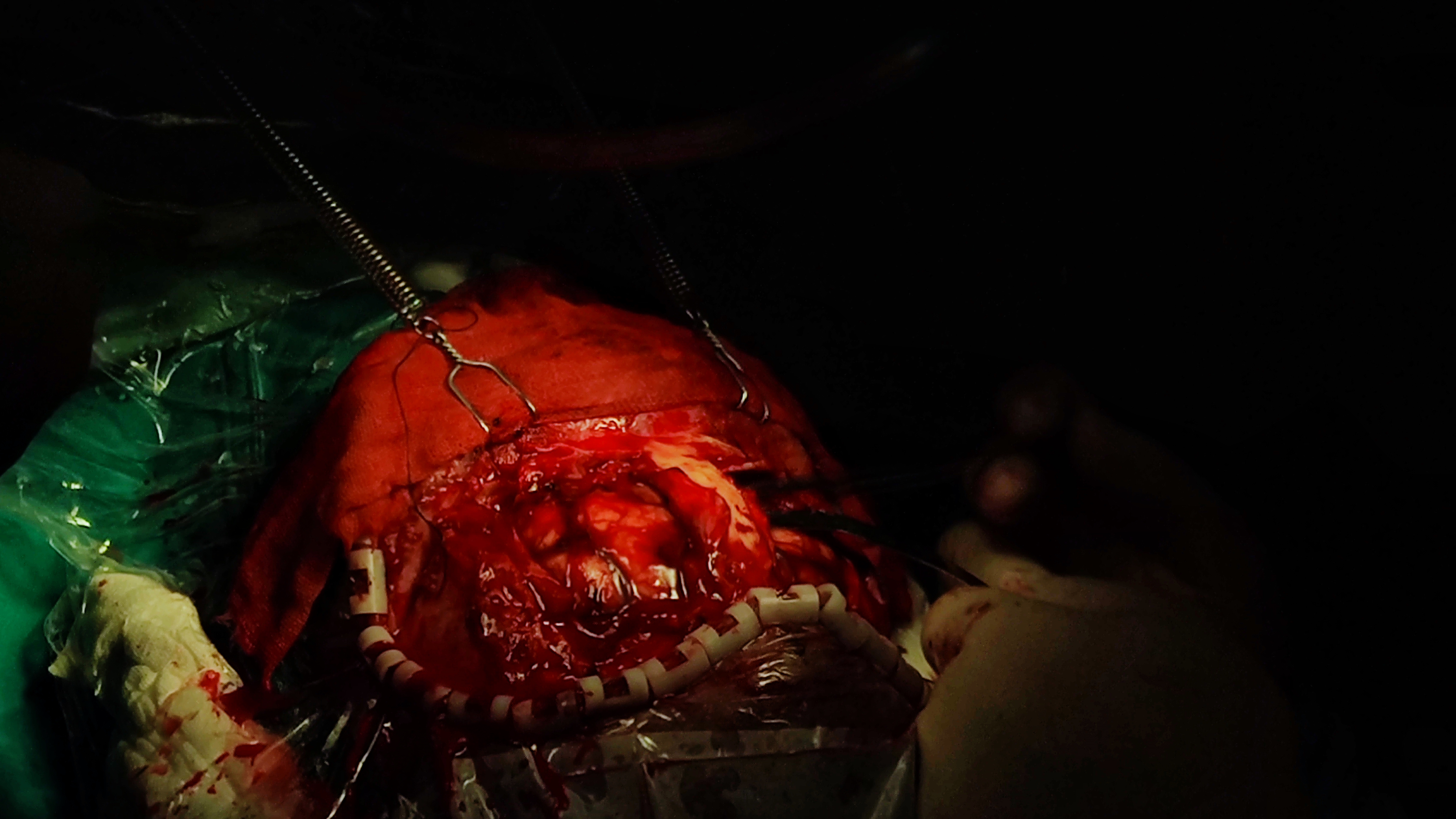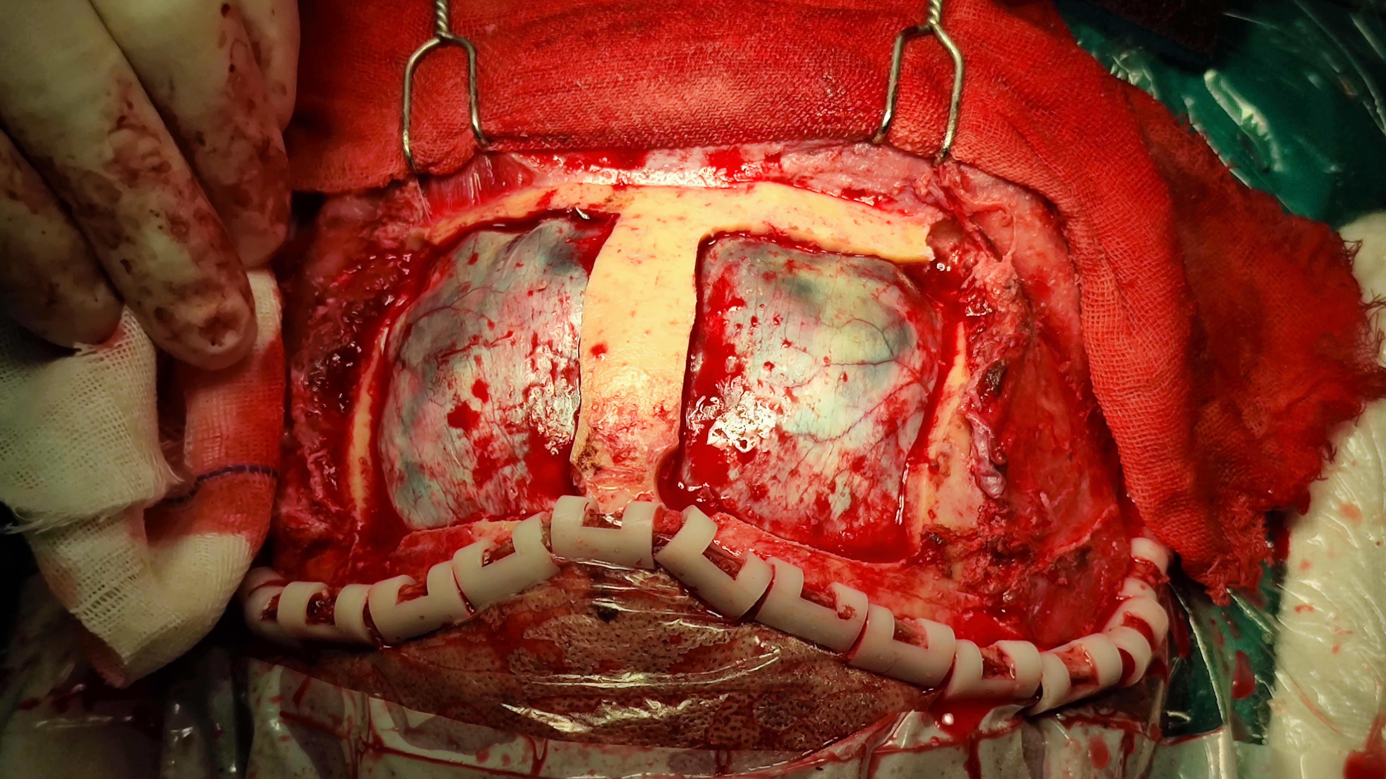 考虑上矢状窦前1/3处理问题,及大脑镰是否打开问题,暂给予矢状窦双侧旁0.5cm钻孔,关键孔钻孔,避开矢状窦铣开双侧骨瓣。颅压高,放射状剪开硬膜,清除血肿及部分挫裂伤额叶脑组织,颅压不高。考虑不扩大骨窗,不切除打通大脑镰,但不给予颅骨还纳,保留中间骨桥。