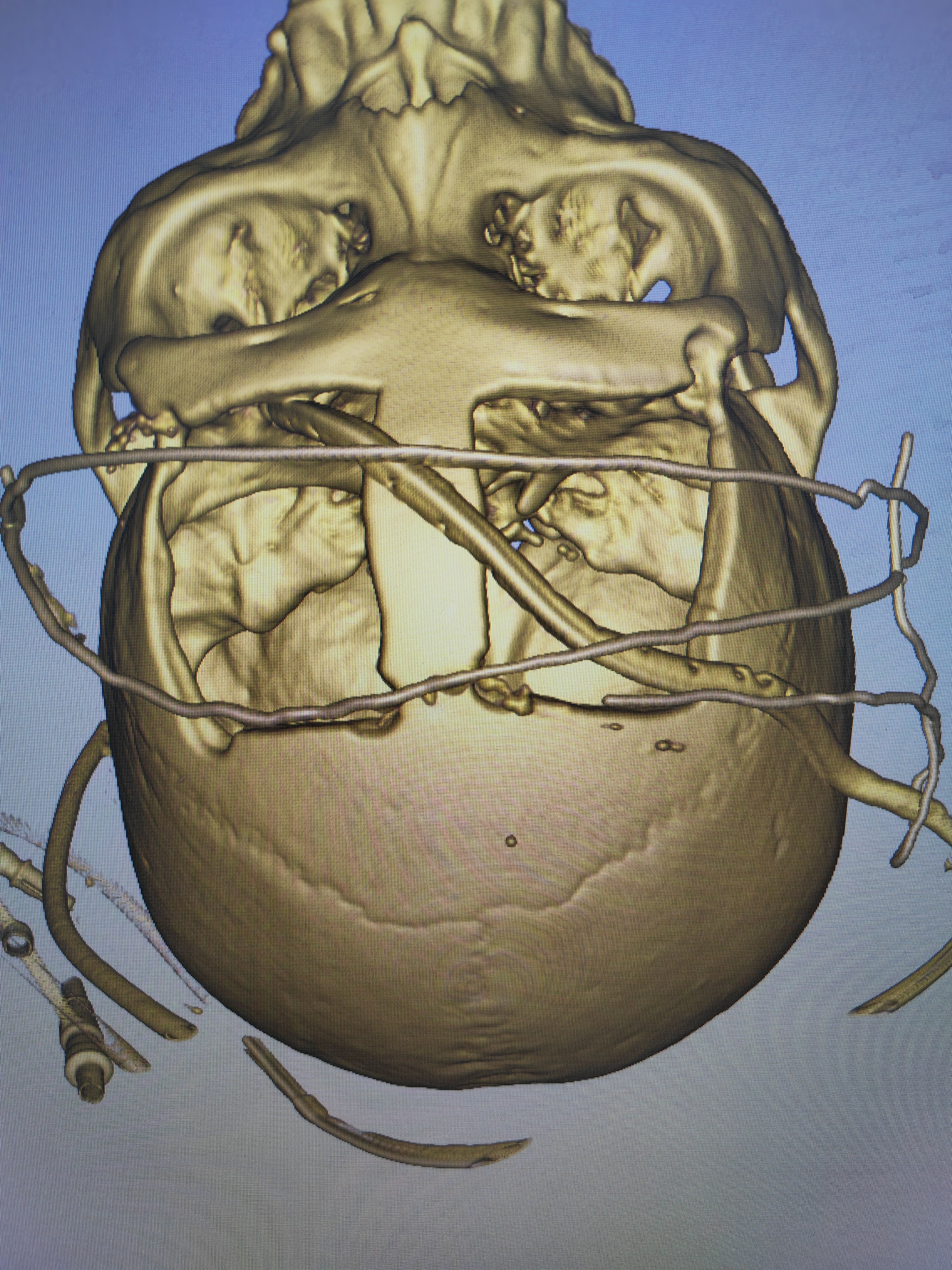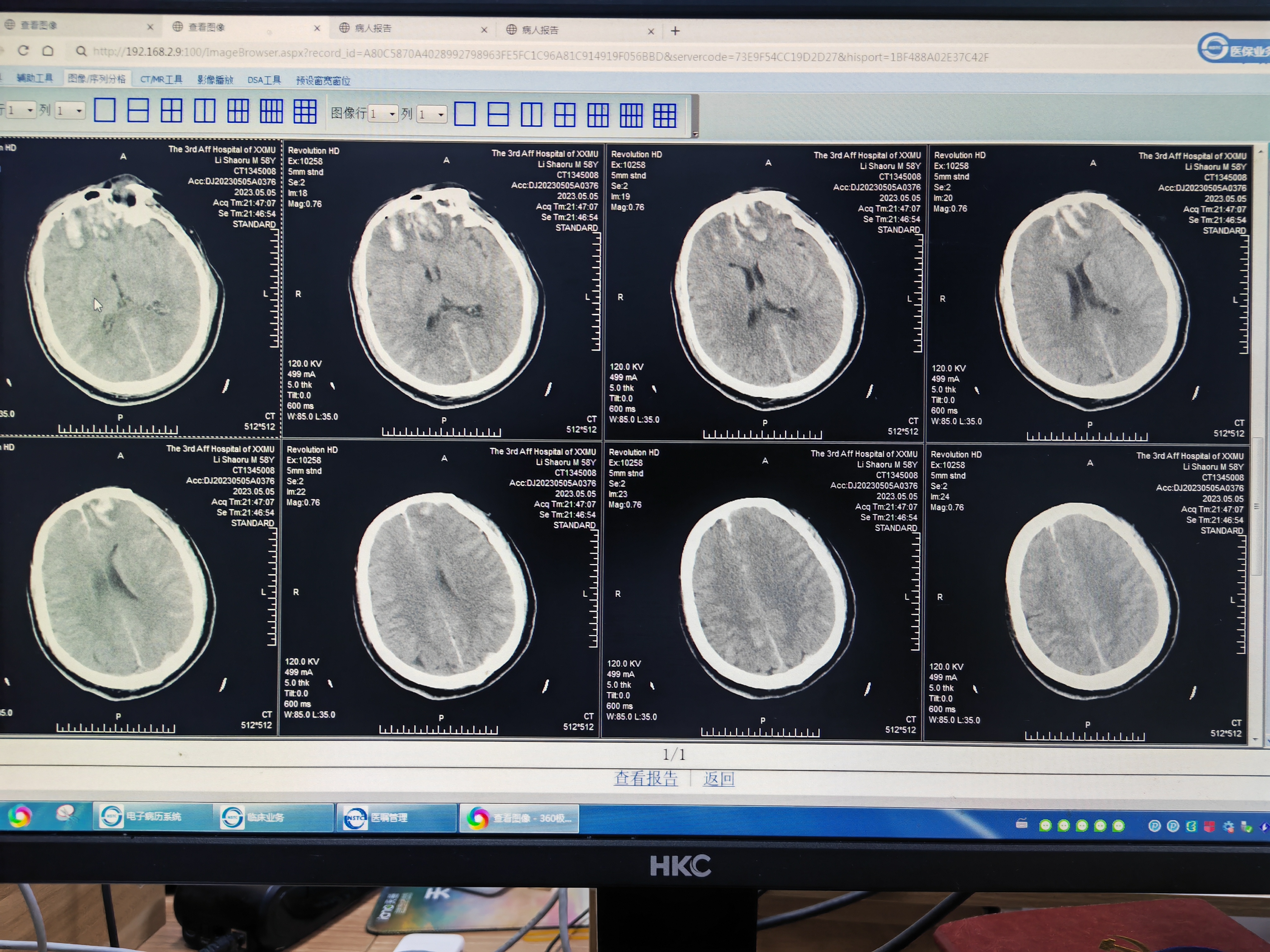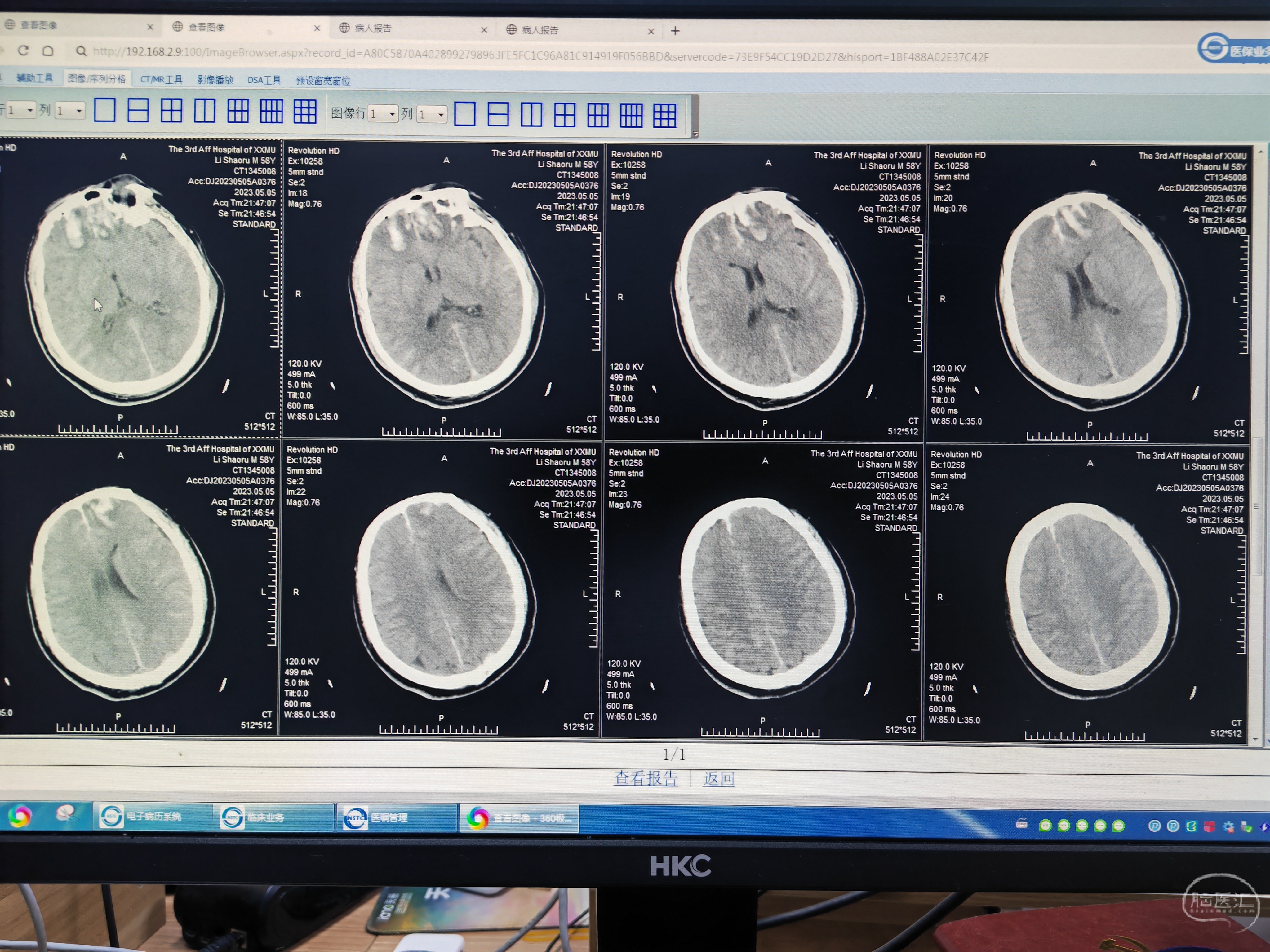 58岁男性,车祸外伤(骑电动车追尾汽车)后摔倒至头痛,烦躁。入院CT见双侧额叶脑挫裂伤,气胸,生命体征不稳定,给予神经外科重症监护室稳定病情,给予猪尾巴管胸腔闭式引流,稳定后立即复查CT。