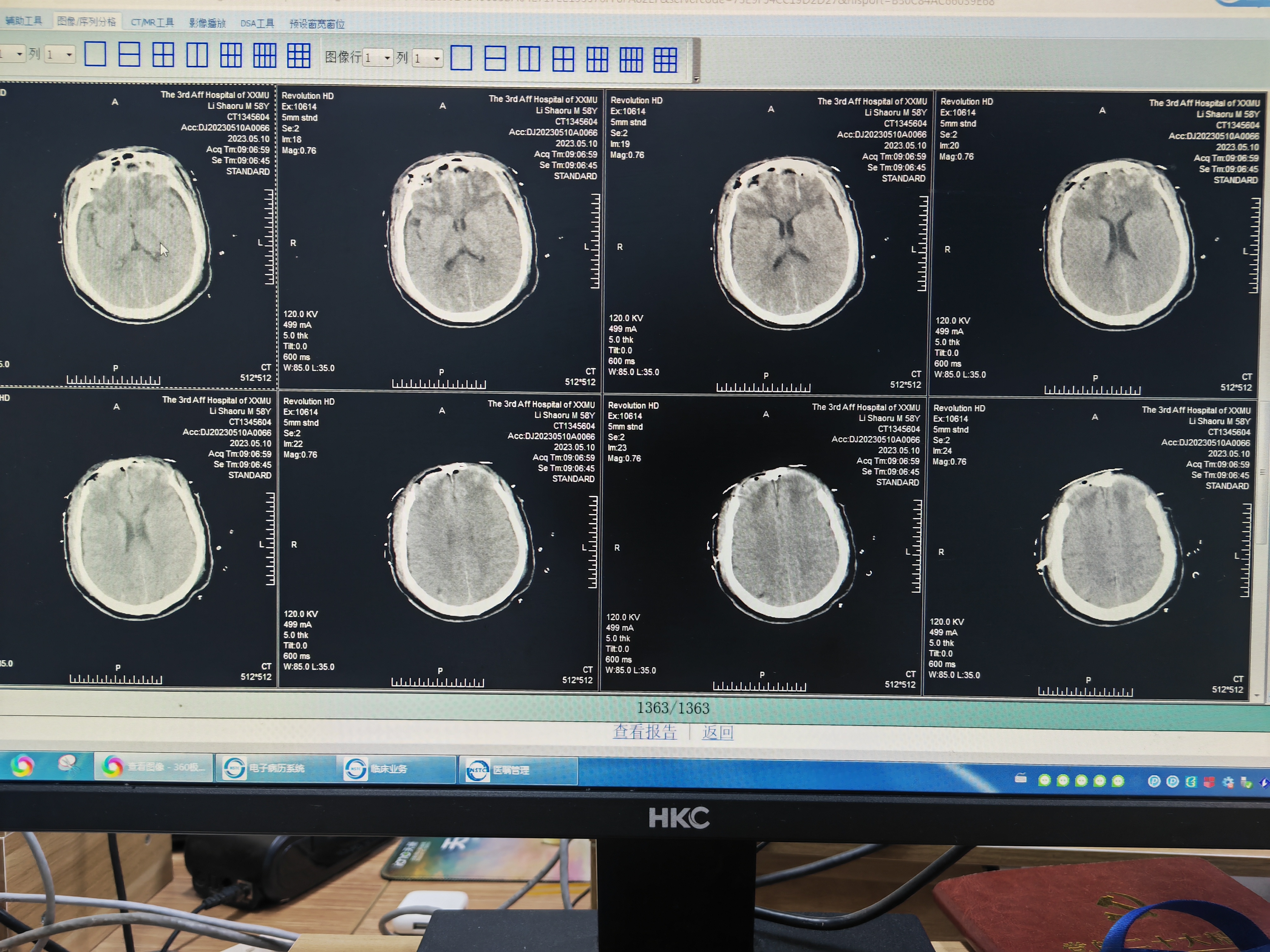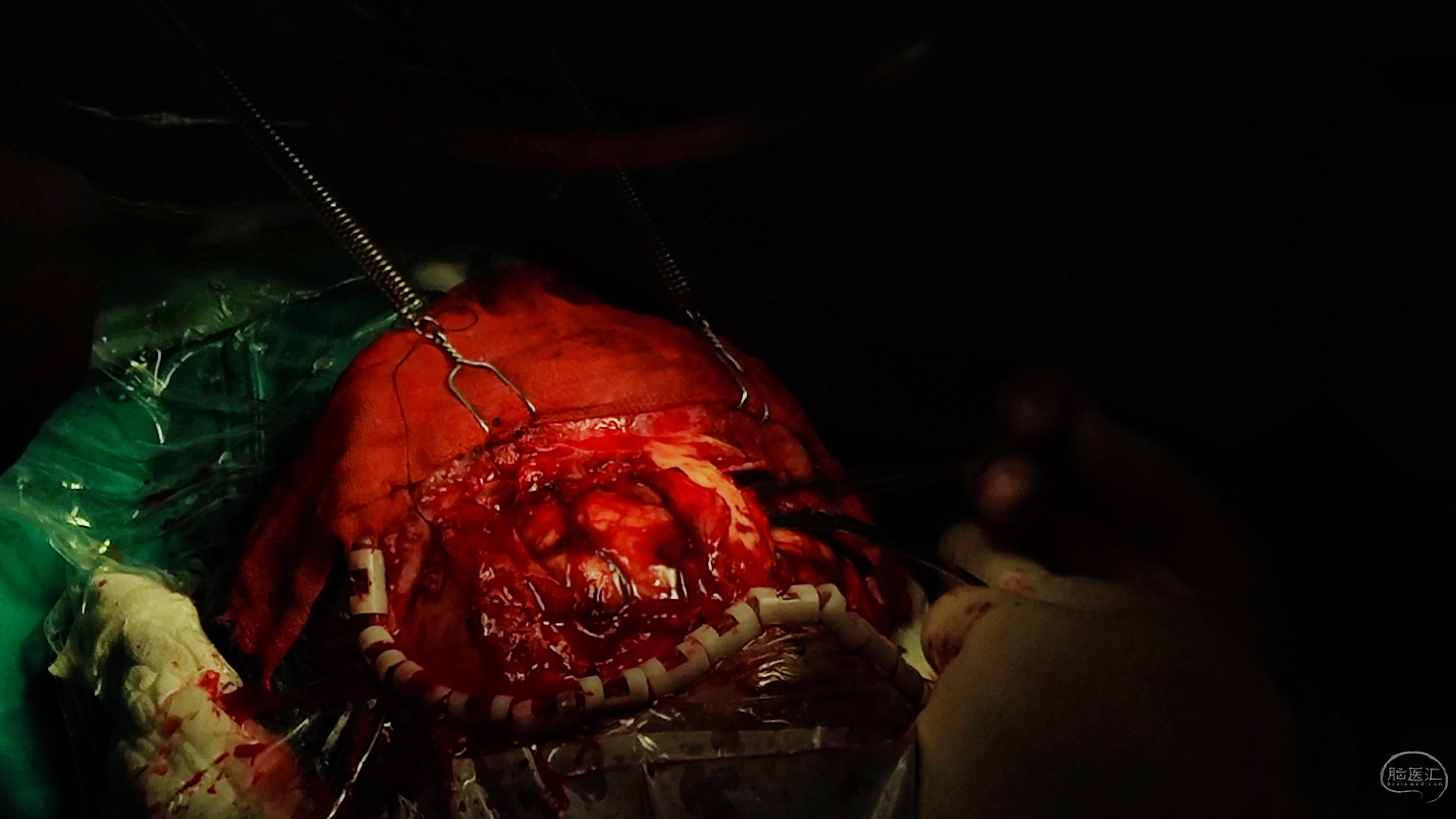 视神经鞘6cm,复查CT.见水肿带明显增多,随时有中央型脑疝可能。与家属沟通给予手术治疗。