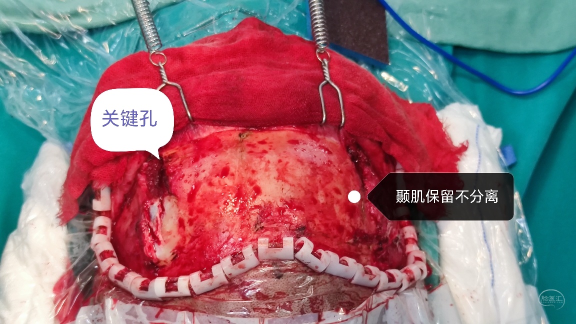 暴露双侧关键孔,保留双侧颞上线肌肉。(如减压后颅压高给予分离肌肉扩大骨窗)