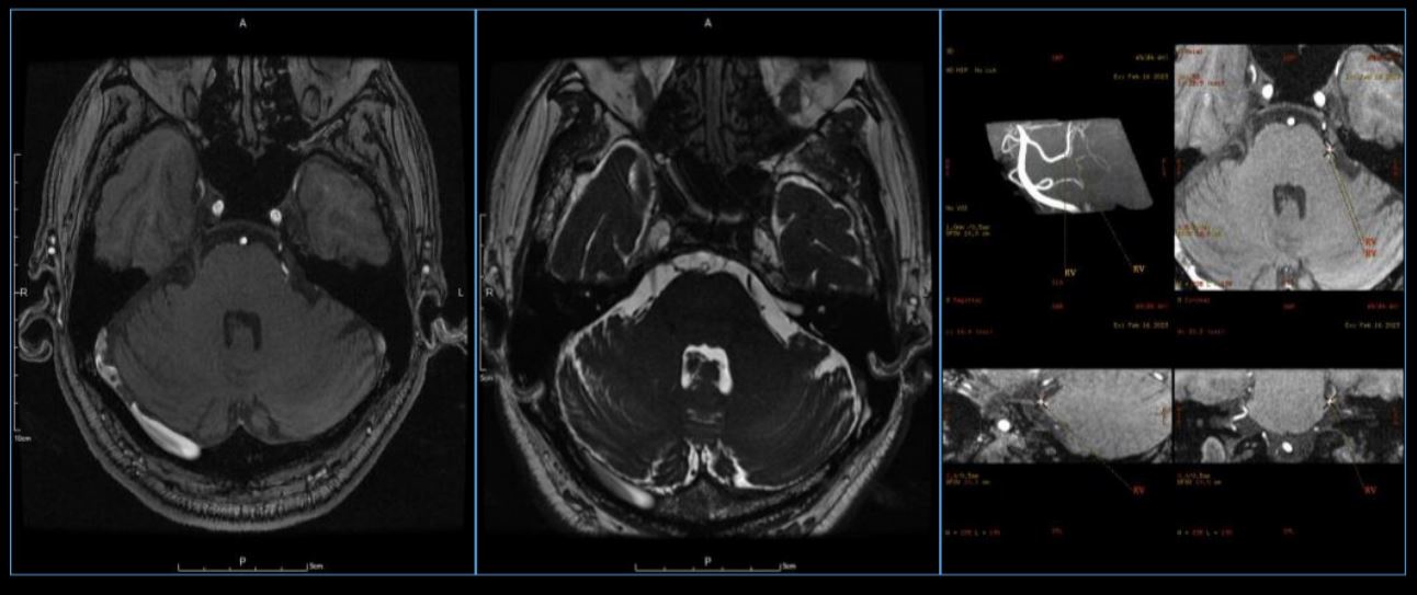 受此启发,我们近期完成1例内镜下经远外侧幕下小脑上入路三叉神经微血管减压术,目前国际国内未有相关文献报道,为该术式行内镜下MVD术国内外第一例,和大家一起分享。患者73岁男性,原发性三叉神经痛两年,口服卡马西平无效来我院治疗。术前磁共振提示左侧的小脑上动脉压迫三叉神经出脑干端(图1)。