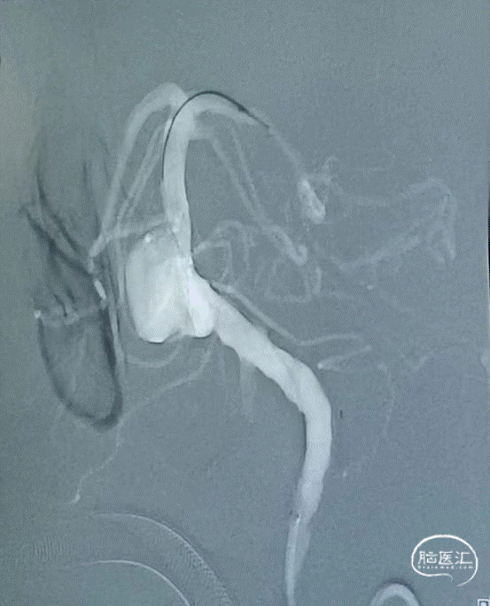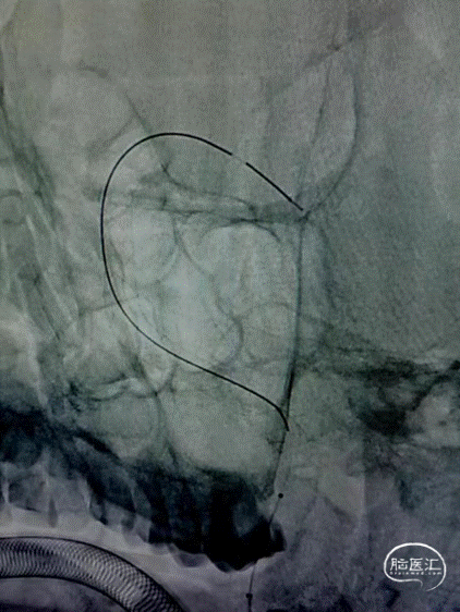 路图下支架微导管在微导丝引导下超选置于左侧大脑后动脉P2段,顺利建立通路,置入Nuva®血流导向密网支架。远端定位在动脉瘤中心以远25mm,近端定位在左侧椎动脉V4段拐弯处。