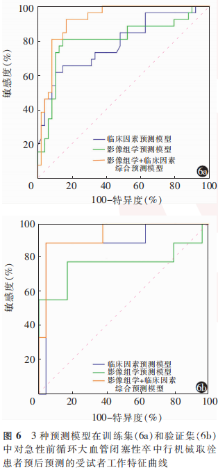 分别在训练集和验证集中比较临床因素预测模型、影像组学预测模型及影像组学+临床因素综合预测模型预测急性前循环大血管闭塞性卒中患者MT后预后不良的AUC。