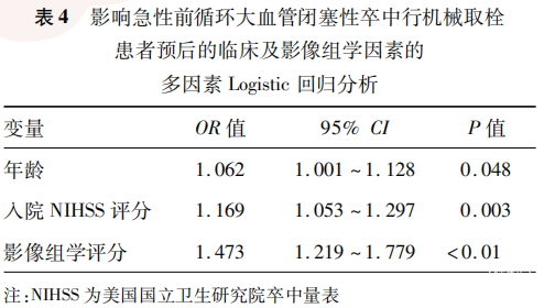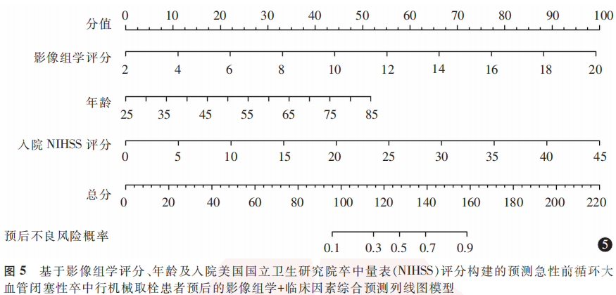 以影像组学评分及年龄、入院NIHSS评分为自变量行多因素Logistic回归分析,结果显示,上述3项因素均为急性前循环大血管闭塞性卒中行MT患者预后不良的影响因素。见表4。联合年龄、NIHSS评分和影像组学评分构建的影像组学+临床因素综合预测列线图模型。见图5。