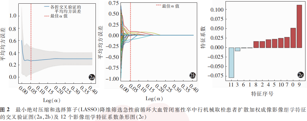 1.5.3 影像组学特征降维及筛选:应用Python 3.6平台Scikit-learn软件包中的train_test_split模块在训练集中对提取处理后得到的影像组学特征值进行特征降维。使用t检验进行特征降维,筛选t检验中P<0.05的变量纳入后续分析。特征筛选采用最小绝对压缩和选择算子(least absolute shrinkage and selection operator, LASSO)模型,使用5折交叉验证,最大迭代次数设定为106次。将筛选得到的影像组学特征纳入后续模型构建。