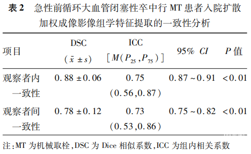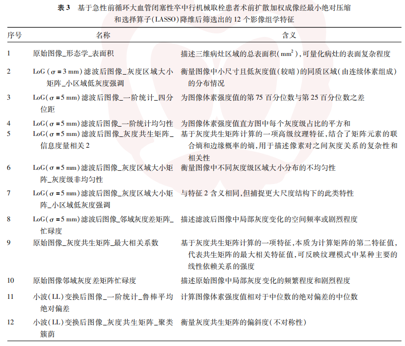 本研究存在一定的局限性。(1)数据来源于多中心研究数据库,影像学设备不统一,图像数据信息规格不完全一致,可能对研究结果产生一定的影响;(2)进行人工图像分割提取后再由软件进行标准化处理,可能会导致效率和选择偏倚;(3)仅采用单一DWI序列进行研究,后期可纳入ADC、液体衰减反转恢复及T2等序列进行多模态研究,增加结果准确性;(4)纳入的样本量较小,易导致过拟合和虚假阳性结果,可能影响模型稳定性,未来需多中心大样本研究进一步验证。