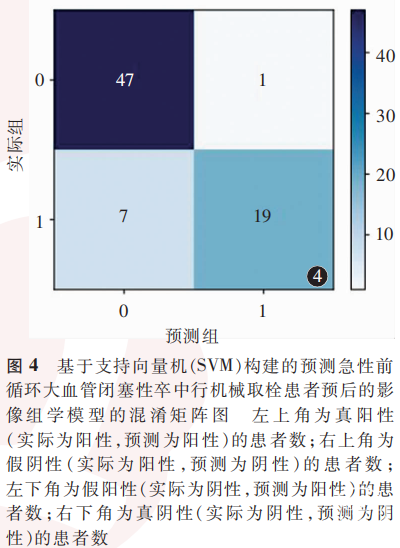 将影像组学特征与临床危险因素相结合可评估卒中后缺血脑组织病理学改变,对急性脑梗死预后具有一定的预测效能。Wang等[44]研究纳入598例急性脑梗死患者,分析得出基于DWI的11项影像组学特征,将其与年龄、脑梗死后出血转化及卒中后24h NIHSS评分等临床因素联合,结果显示,影像组学与临床因素联合模型可用于预测行标准药物治疗的急性脑梗死患者发病后90d的神经功能预后(训练集AUC为0.80,95%CI:0.75~0.86;验证集AUC为0.73,95% CI:0.63~0.82)。Zhou等[45]纳入522例急性缺血性卒中患者,基于DWI和ADC的7项影像组学特征与临床因素(年龄、性别、既往卒中史、糖尿病、基线mRS评分和基线NIHSS评分)联合预测急性脑梗死患者经药物治疗出院后6个月的预后情况,结果显示,其预测效能优于单纯临床模型(训练集AUC为0.868比0.823,P=0.004;验证集AUC为0.890比0.844,P=0.004)和影像组学模型(训练集AUC为0.868比0.767,P<0.01;验证集AUC为0.890比0.784,P<0.01)。一项研究纳入了行MT、静脉溶栓及药物治疗的190例急性缺血性卒中患者,结果显示,临床因素(年龄、性别及基线NIHSS评分)+常规MRI (DWI-ASPECTS)+影像组学(联合液体衰减反转恢复序列和ADC等提取出的6项影像组学特征)的综合模型对急性脑梗死患者发病后90d预后的预测效能高于单纯临床模型(训练集AUC:0.926比0.791,P=0.003;验证集AUC:0.864比0.763,P=0.031)和影像预测模型(训练集AUC:0.926比0.815,P=0.001;验证集AUC:0.864比0.825,P=0.041)[46]。一项研究基于168例行静脉溶栓或常规药物治疗的缺血性卒中患者ADC和灌注图像提取出7项影像组学特征,结果显示,基于缺血半暗带定量分析的影像组学特征可作为预测急性缺血性卒中患者卒中后3个月预后的标志物,提取出的7项影像组学特征形成的影像组学评分对于急性缺血性卒中患者发病后90d预后具有一定的预测效果(训练集AUC为0.783,95%CI:0.757~0.808,P<0.01;验证集AUC为0.695,95% CI:0.667 ~ 0.723,P<0.01)[47]。Qiu等[48]纳入67例接受静脉溶栓的缺血性卒中患者,结果显示,基于CT和CT血管成像提取的12项影像组学特征可用于预测急性缺血性卒中患者静脉溶栓治疗后的血管再通情况(训练集平均AUC为0.85±0.03, P<0.01)。