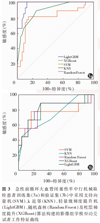 1.5.4 影像组学预测模型构建及评分计算:使用Python 3.6平台Scikit-learn软件包自定义脚本实现机器学习模型算法调用。采用支持向量机(support vector machine, SVM)、k近邻、轻量级梯度提升机、随机森林及极限梯度提升算法分别构建模型,各模型具体参数使用网格搜索交叉验证法获得。采用受试者工作特征(receiver operating characteristic, ROC)曲线分析并比较各模型的曲线下面积(area under the curve, AUC),并在验证集中验证,筛选最合适的影像组学模型。以该模型计算得到的对预后的预测概率值作为影像组学评分。