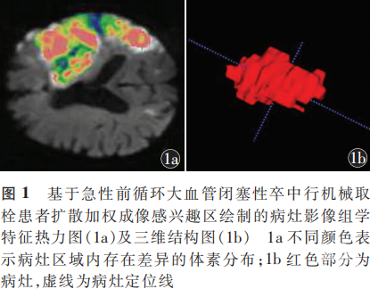 1.5.1 图像分割与标注:使用ITK-SNAP软件导入DICOM格式的MR文件,在DWI序列中将高信号区域作为感兴趣区连续分割并标注(图1a,1b)。完成分割标注后生成相应图像与蒙版Nifti格式文件,进行图像标准化处理后,以2mm×2mm×2mm像素进行图像重采样。