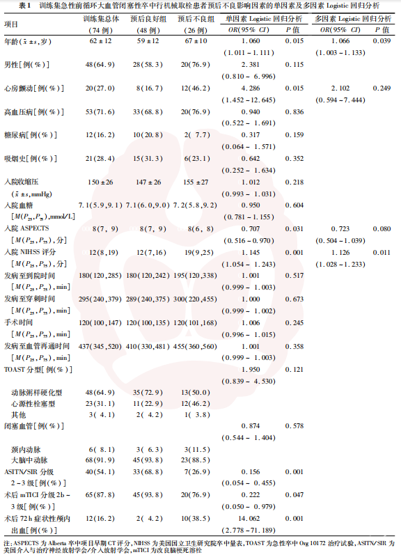 共纳入前循环大血管闭塞性卒中行MT患者107例,男72例,女35例,年龄27~87岁,中位年龄64(56,71)岁。训练集74例,其中预后良好患者48例,预后不良患者26例;验证集33例,其中预后良好患者24例,预后不良患者9例。