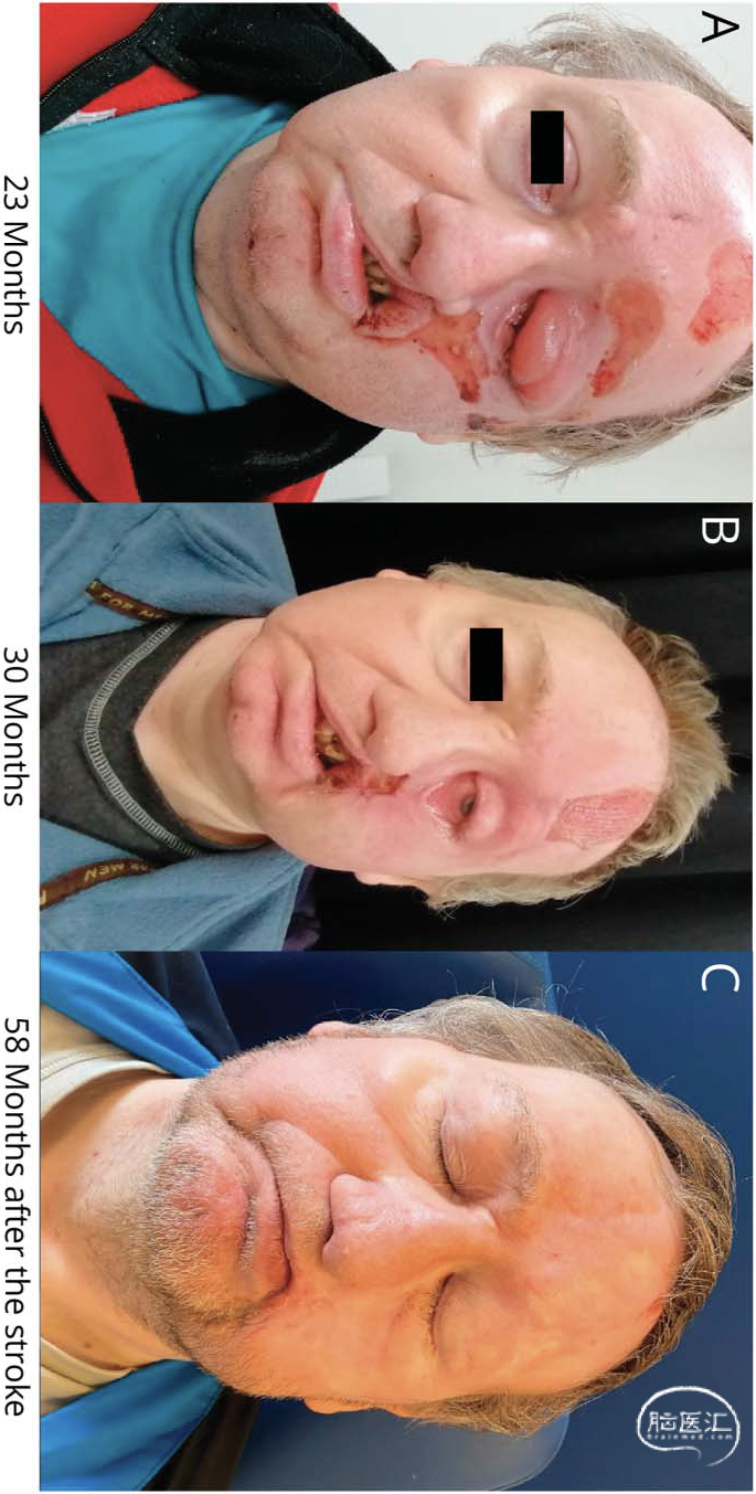 图2 本研究患者三叉神经营养综合征病情演变照片。卒中后23个月(2020年8月;拍摄:P.M.)皮肤、眼睑及唇部病变情况(A)。卒中后30个月(2021年3月;拍摄:P.M.)经药物治疗及初步整形手术后的病变状态(B)。卒中后58个月(2023年7月;拍摄:C.M.O.)经进一步外科干预后的病变状态(C):