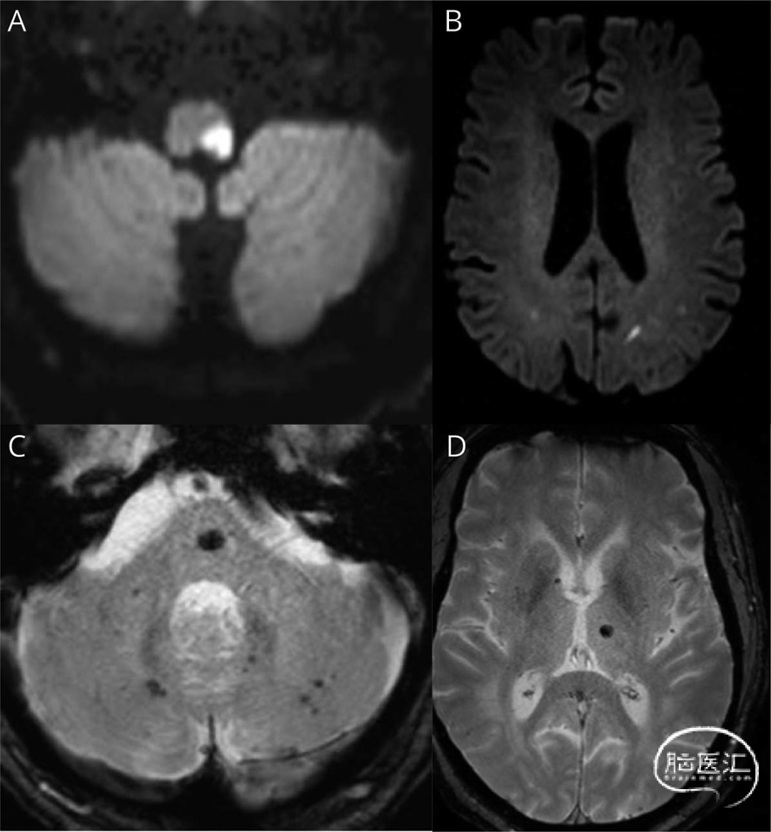 图1 脑磁共振成像(MRI)。急性期轴位弥散加权成像(DWI)(A)显示左侧延髓卒中。24小时后复查轴位MRI(含DWI序列)(B)显示新发大脑半球深部分水岭区病灶;小脑水平磁敏感加权成像(SWI)(C)与丘脑水平SWI(D)显示幕上及幕下多发急性微出血灶: