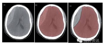 图1. 将图像分割协定法应用于硬膜外血肿患者的实例:a.右侧硬膜外血肿;b.全脑结构的图像分割;c.从图像中手工去除血肿。