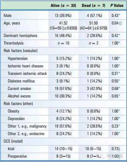 表1. 大脑中动脉梗阻患者去骨瓣减压后存活与死亡患者的资料。