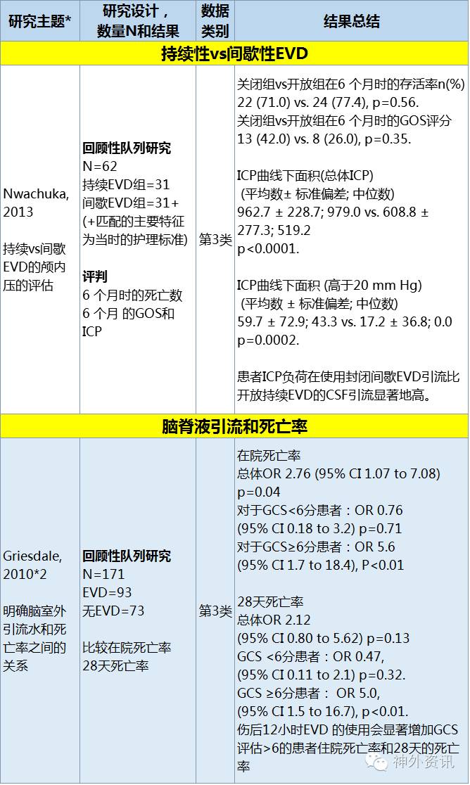 两个研究都是单中心研究。EVD引流脑脊液可降低ICP;但是,对于EVD对TBI患者是否可提高存活率/降低死亡率TBI仍然缺乏证据。持续脑脊液引流对于降ICP可能优于间歇性引流, 但这一结论需要来自多中心的数据论证,且其并发症也需要被评估。