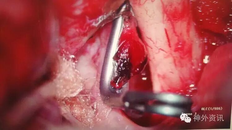 5. 本例患者前交通开放,首选夹闭,次之孤立,由于颈动脉壁累及范围较局限,夹闭顺利!