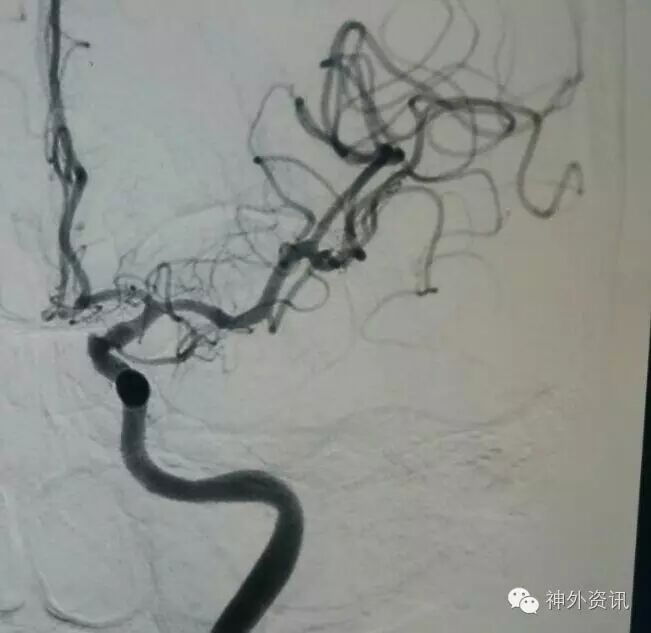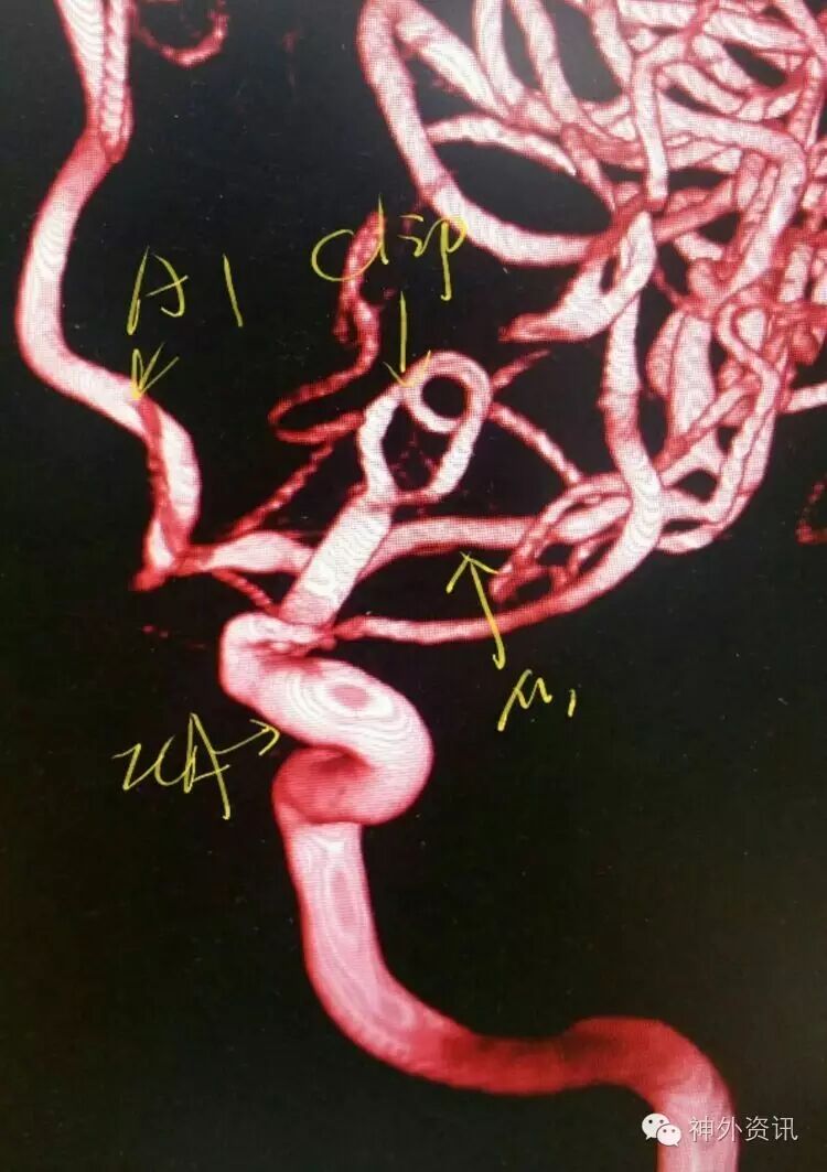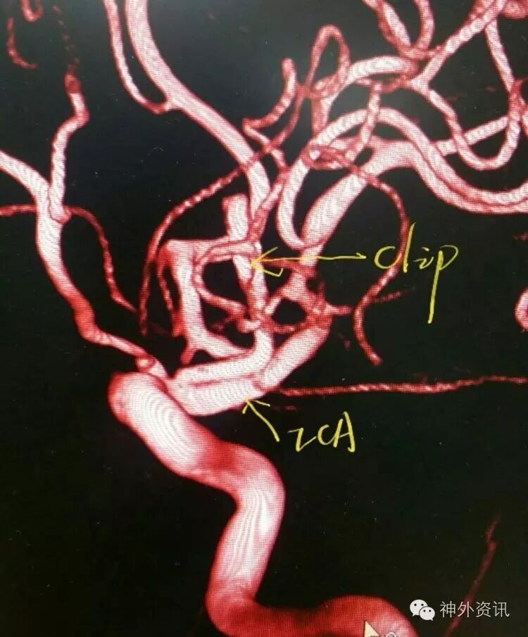 术后一w3-D造影正位所見瘤夹及远端A1、M1及以远血管正常显影!