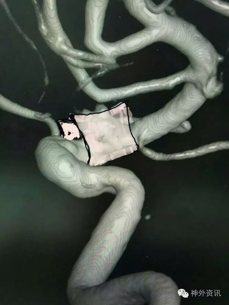 术中见颈动脉前壁局部为血块覆盖,分离血块見局部血管壁正常结构破坏,似单层红色保鲜膜,累及管壁周径约1/5~1/4,IcA后方见脉前、后交通A发出,包裹术无法完成!