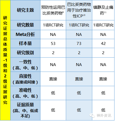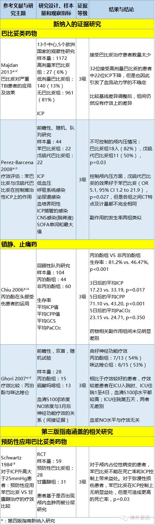巴比妥类药物的III级证据研究未能提供有效结果以供形成新的诊疗推荐,或形成与2级研究证据不同的修改诊疗推荐。一项多中心、多国家的回顾性研究发现较低的总巴比妥使用剂量,即使在调整基线差异之后,仍然在疗效上无明显差别;而当ICP升高时,巴比妥治疗可造成血液动力学的不稳定12。同样,先前版本指南涵盖的3级证据研究发现巴比妥治疗并无明显益处,甚至使用苯巴比妥患者死亡率更高16。一项研究比较了苯巴比妥与戊硫代巴比妥,研究结果提示戊硫代巴比妥可更加有效的控制ICP,但是患者个体特点的差异以及剂量的不同都是的该项研究的可信度下降13。