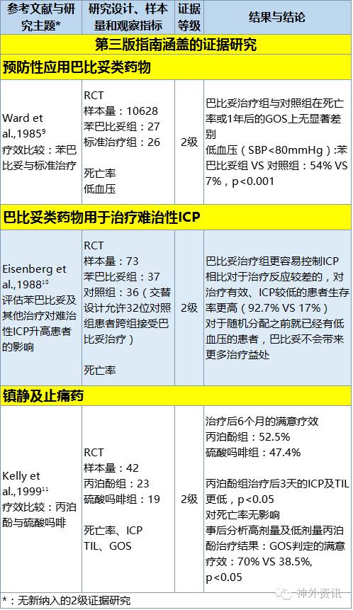 1999年,Cochrane创伤组对所有用巴比妥类药物处理急性TBI的RCT研究,实施了一项系统回顾,并定期对研究结果更新2。最新版更新(2012年)并未纳入任何新的证据研究。该协作组做出如下推论:并无相关证据提示巴比妥治疗急性重症颅脑损伤的患者可改善预后;4位接受巴比妥治疗的患者中有1位出现了血压下降;巴比妥治疗可造成ICP的下降,并对脑灌注压产生影响;但是该影响可被巴比妥同时引发的低血压所抵消。该项系统回顾所纳入的研究实施时间都早于该版本最初的文献搜索日期,除了Perez-Barcena在2008年的研究,该研究已被纳入本次指南。