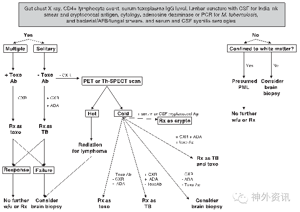 Raymond等人分享了他们的检查流程和诊断经验,包括胸片、CD4+淋巴细胞数,血弓形体IgG水平,腰穿脑脊液墨汁染色、隐球菌抗原、细胞学、ADA、结核分枝杆菌PCR、细菌/真菌/分枝杆菌涂片和培养,血清、脑脊液梅毒螺旋体筛查,以及SPECT或PET检查。CD4+细胞数<200/ml者以弓形虫、隐球菌等机会性感染和恶性肿瘤多见,而>200/ml则以结核、细菌等非机会性感染颅为主。如影像学提示多发占位,弓形虫病首先考虑,结合抗体阳性,可启动抗弓形虫病治疗;如为孤立性病灶,需结合胸片和ADA测定,均阳性则启动抗痨治疗,若胸片阴性则进一步行PET或SPECT检查,病灶代谢增高需考虑淋巴瘤,活检并行放疗治疗,代谢减低则需结合各病原学血清、脑脊液检查结果,如全为阴性则考虑活检明确诊断(图3)[4]。