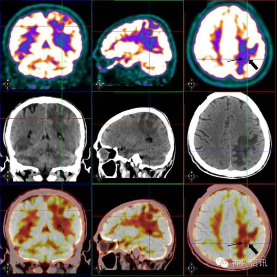 图2. PET-CT所示左侧顶叶病灶,考虑为囊性病灶,周围可见水肿带,周围正常脑皮质呈高代谢,SUVmax=15.1,囊壁糖代谢稍增高,SUVmax=3.7,病灶中心(粗黑色箭头)及水肿带糖代谢减低。