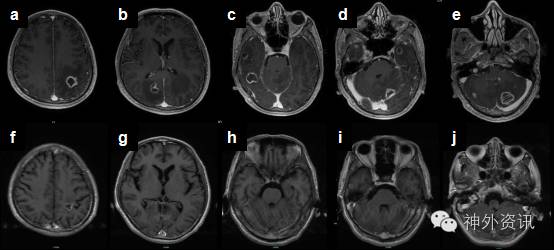 患者1月前无明显诱因下出现头胀嗜睡,伴记忆力下降,查头颅MRI提示:两侧大脑、小脑半球多发占位,环形强化,伴周围水肿,考虑转移性肿瘤(图1a-e)。