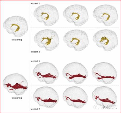 图2. 专家手绘纤维束图。比较两名参与者弓状束(上,黄色)和下额枕束(下,红色)聚类模型结果。每名专家每天至少要重复绘制3次。左侧为聚类模型分析图,右侧为专家手绘图;两者有很大的相关性。